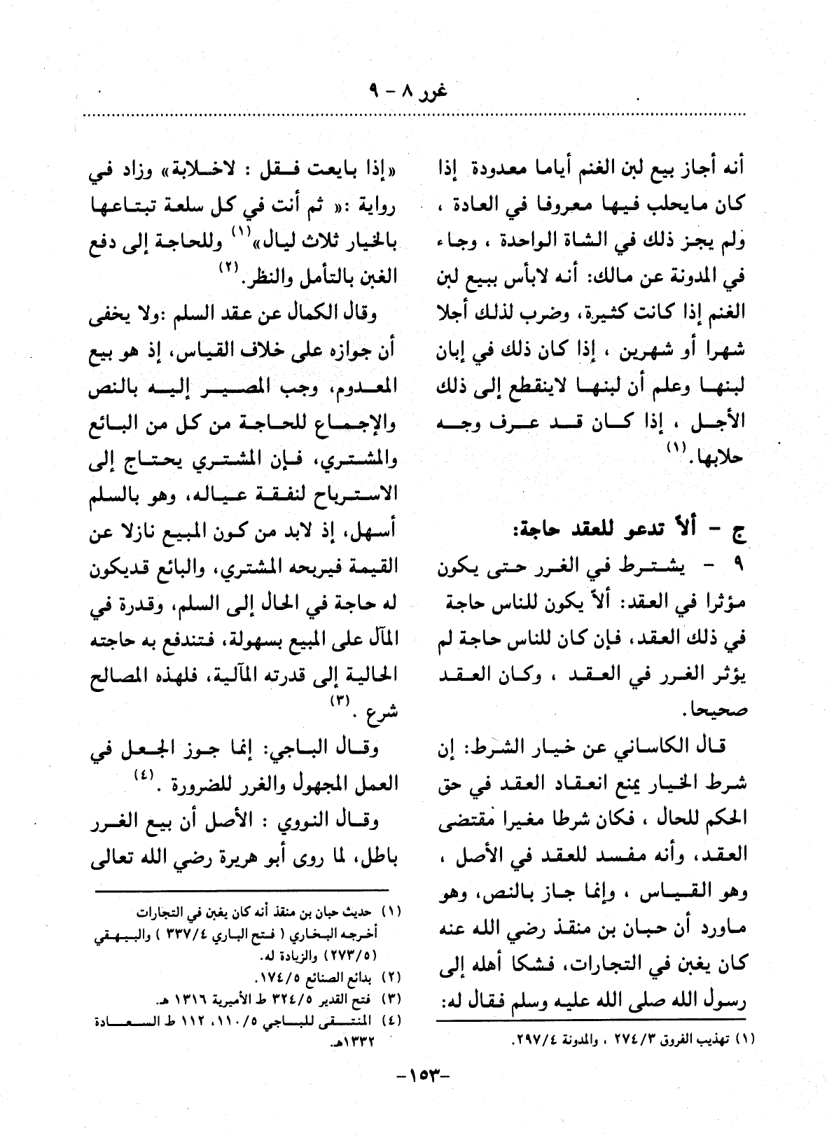 9 - يُشْتَرَطُ فِي الْغَرَرِ حَتَّى يَكُونَ مُؤَثِّرًا فِي الْعَقْدِ: أَلاَّ يَكُونَ لِلنَّاسِ حَاجَةٌ فِي ذَلِكَ الْعَقْدِ، فَإِنْ كَانَ لِلنَّاسِ حَاجَةٌ لَمْ يُؤَثِّرِ الْغَرَرُ فِي الْعَقْدِ، وَكَانَ الْعَقْدُ صَحِيحًا.