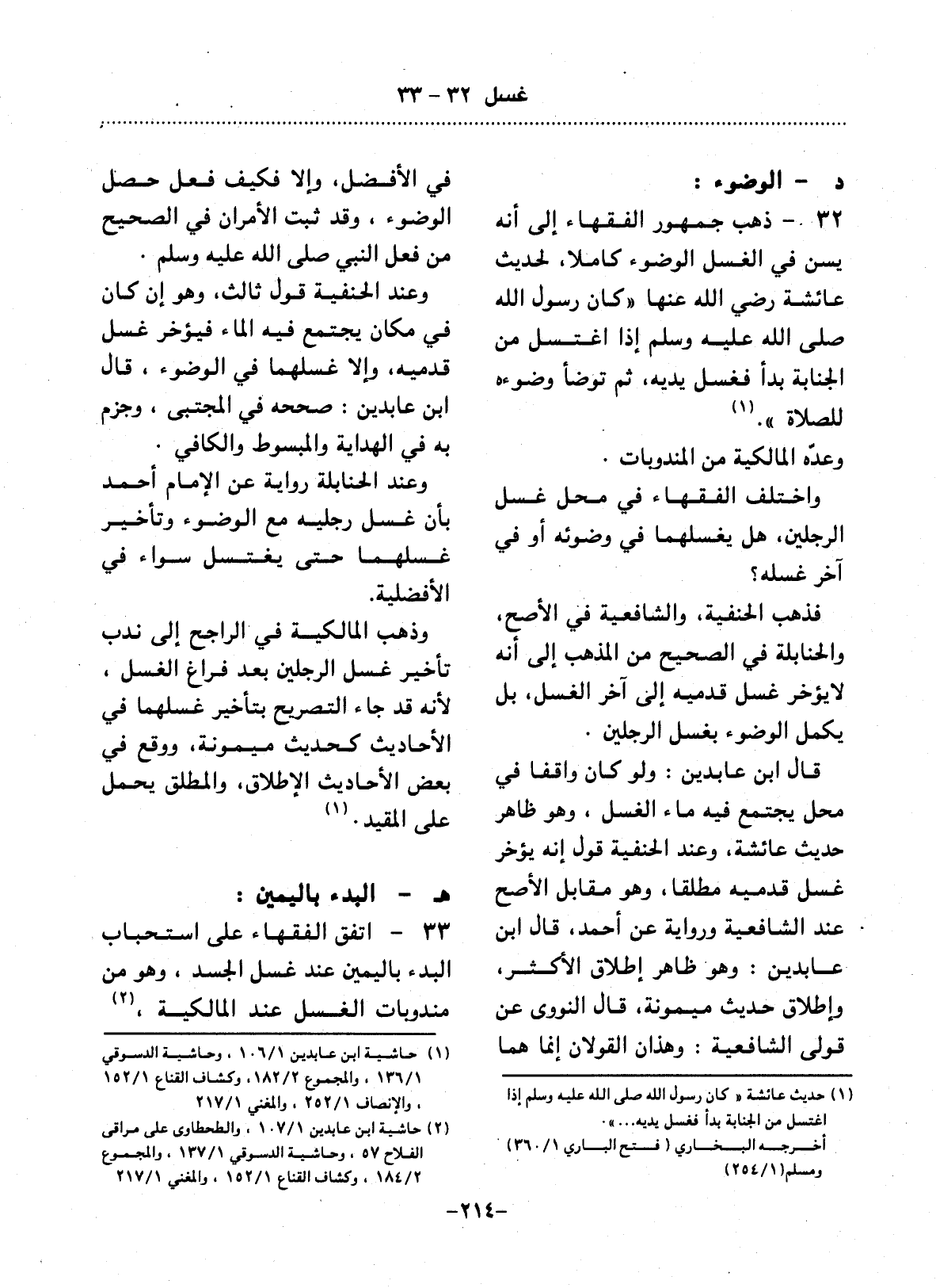 33 - اتَّفَقَ الْفُقَهَاءُ عَلَى اسْتِحْبَابِ الْبَدْءِ بِالْيَمِينِ عِنْدَ غُسْل الْجَسَدِ، وَهُوَ مِنْ مَنْدُوبَاتِ الْغُسْل عِنْدَ الْمَالِكِيَّةِ (2) ،