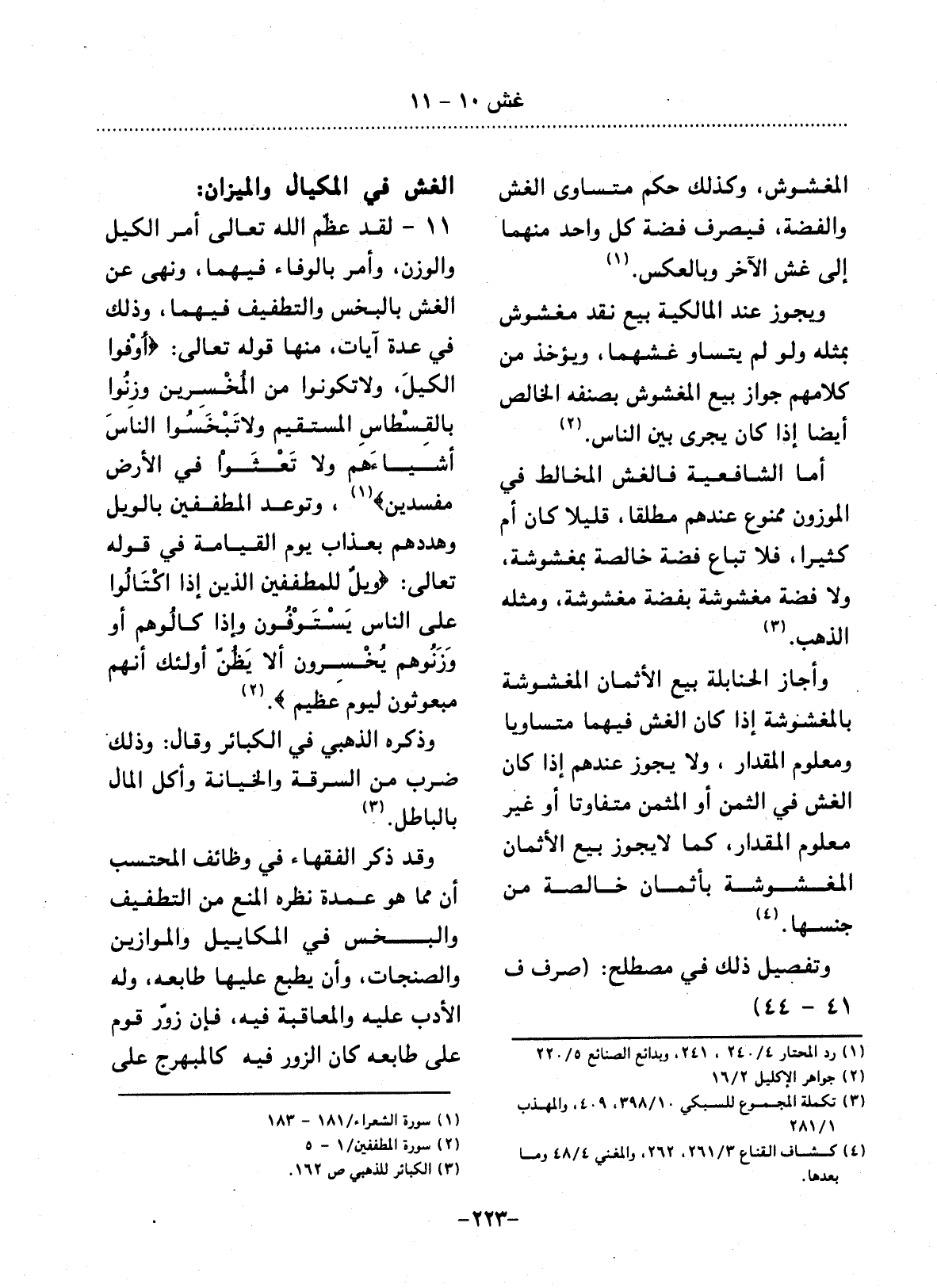 11 - لَقَدْ عَظَّمَ اللَّهُ تَعَالَى أَمْرَ الْكَيْل وَالْوَزْنِ، وَأَمَرَ بِالْوَفَاءِ فِيهِمَا، وَنَهَى عَنِ الْغِشِّ بِالْبَخْسِ وَالتَّطْفِيفِ فِيهِمَا، وَذَلِكَ فِي عِدَّةِ آيَاتٍ، مِنْهَا قَوْله تَعَالَى: (أَوْفُوا الْكَيْل وَلاَ تَكُونُوا مِنَ الْمُخْسِرِينَ وَزِنُوا بِالْقِسْطَاسِ الْمُسْتَقِيمِ وَلاَ تَبْخَسُوا النَّاسَ أَشْيَاءَهُمْ وَلاَ تَعْثَوْا فِي الأَْرْضِ مُفْسِدِينَ) (1) ، وَتَوَعَّدَ الْمُطَفِّفِينَ بِالْوَيْل وَهَدَّدَهُمْ بِعَذَابٍ يَوْمَ الْقِيَامَةِ فِي قَوْله تَعَالَى: (وَيْلٌ لِلْمُطَفِّفِينَ الَّذِينَ إِذَا اكْتَالُوا عَلَى النَّاسِ يَسْتَوْفُونَ وَإِذَا كَالُوهُمْ أَوْ وَزَنُوهُمْ يُخْسِرُونَ أَلاَ يَظُنُّ أُولَئِكَ أَنَّهُمْ مَبْعُوثُونَ لِيَوْمٍ عَظِيمٍ) (2) .