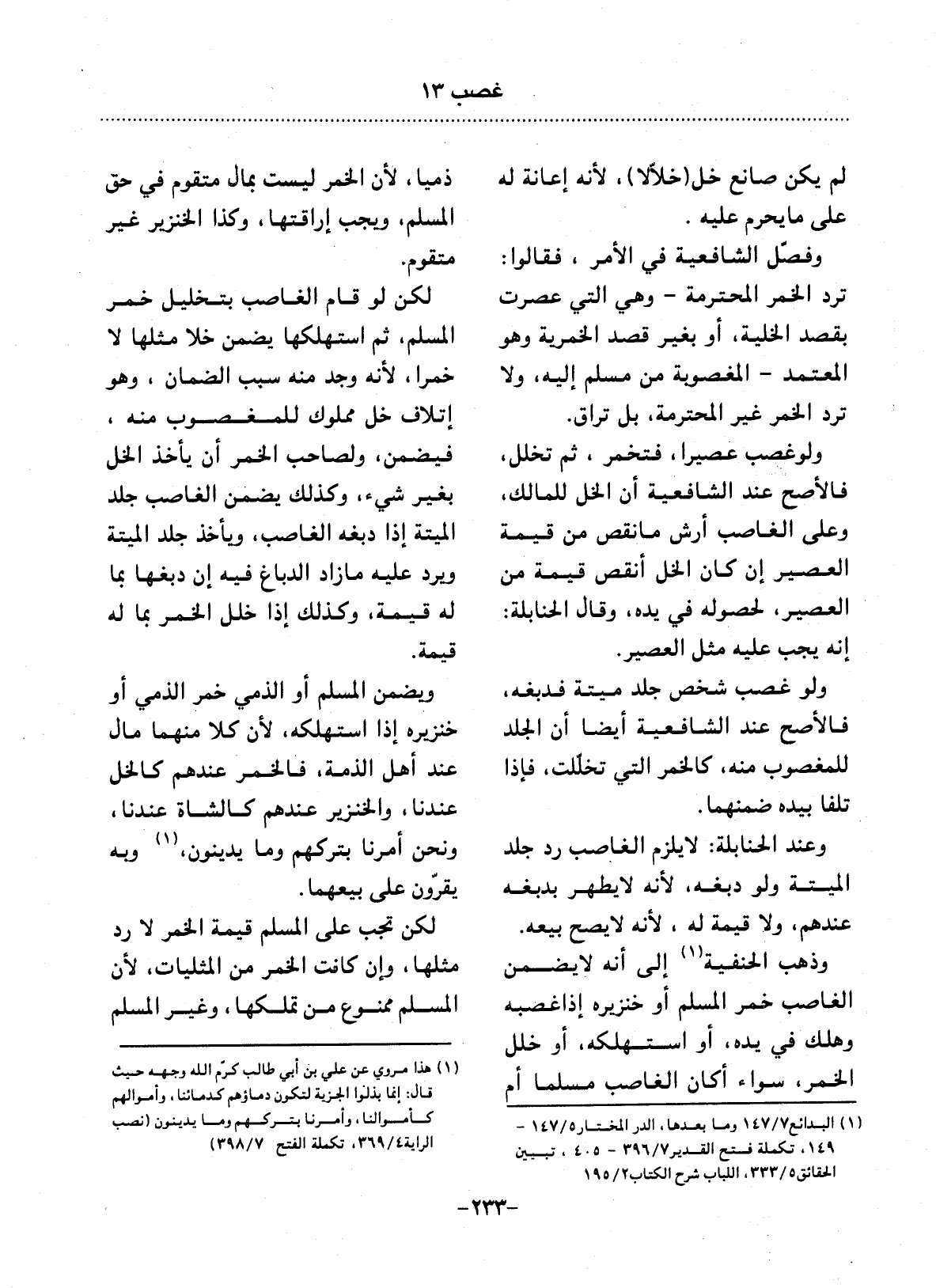 وَذَهَبَ الْحَنَفِيَّةُ (1) إِلَى أَنَّهُ لاَ يَضْمَنُ الْغَاصِبُ خَمْرَ الْمُسْلِمِ أَوْ خِنْزِيرَهُ إِذَا غَصَبَهُ وَهَلَكَ فِي يَدِهِ، أَوِ اسْتَهْلَكَهُ، أَوْ خَلَّل الْخَمْرَ، سَوَاءٌ أَكَانَ الْغَاصِبُ مُسْلِمًا أَمْ