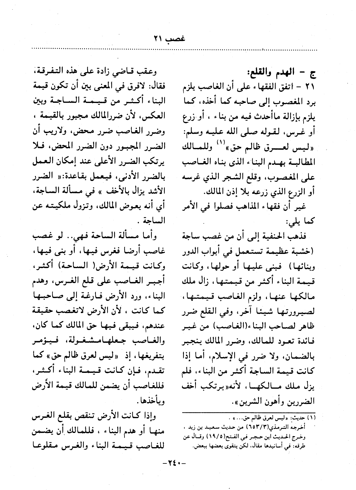 21 - اتَّفَقَ الْفُقَهَاءُ عَلَى أَنَّ الْغَاصِبَ يُلْزَمُ بِرَدِّ الْمَغْصُوبِ إِلَى صَاحِبِهِ كَمَا أَخَذَهُ، كَمَا يُلْزَمُ بِإِزَالَةِ مَا أَحْدَثَ فِيهِ مِنْ بِنَاءٍ، أَوْ زَرْعٍ أَوْ غَرْسٍ، لِقَوْلِهِ صَلَّى اللَّهُ عَلَيْهِ وَسَلَّمَ: لَيْسَ لِعِرْقِ ظَالِمٍ حَقٌّ (1) وَلِلْمَالِكِ الْمُطَالَبَةُ بِهَدْمِ الْبِنَاءِ الَّذِي بَنَاهُ الْغَاصِبُ عَلَى الْمَغْصُوبِ، وَقَلْعِ الشَّجَرِ الَّذِي غَرَسَهُ أَوِ الزَّرْعِ الَّذِي زَرَعَهُ بِلاَ إِذْنِ الْمَالِكِ.