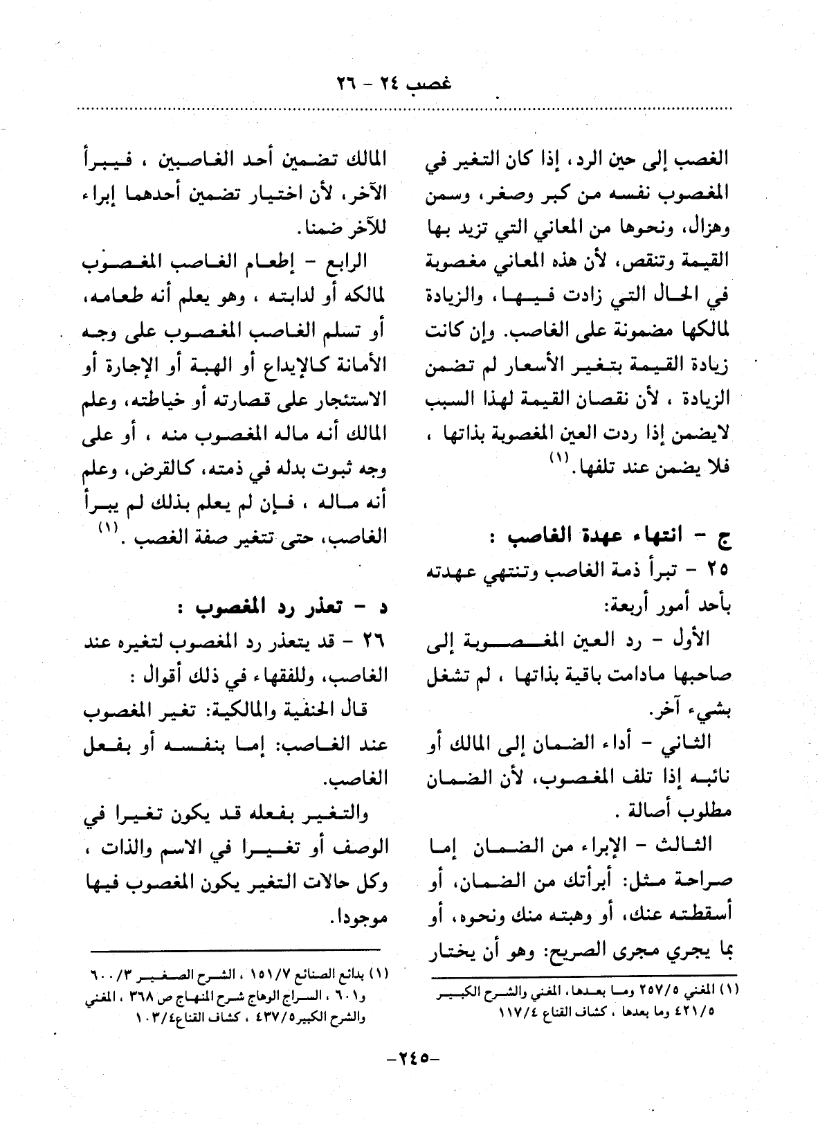 25 - تَبْرَأُ ذِمَّةُ الْغَاصِبِ وَتَنْتَهِي عُهْدَتُهُ بِأَحَدِ أُمُورٍ أَرْبَعَةٍ:
