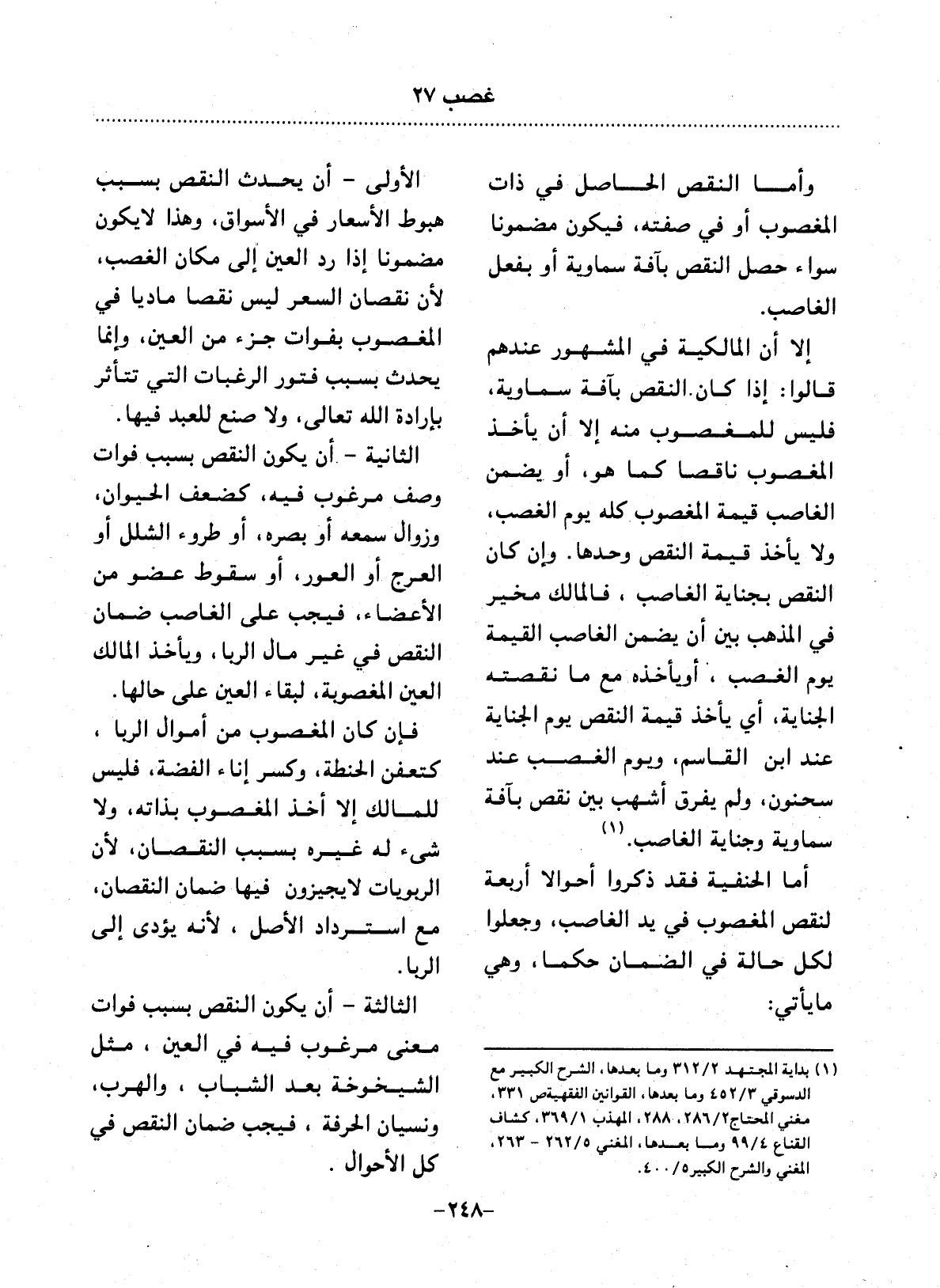 وَأَمَّا النَّقْصُ الْحَاصِل فِي ذَاتِ الْمَغْصُوبِ أَوْ فِي صِفَتِهِ. فَيَكُونُ مَضْمُونًا سَوَاءٌ حَصَل النَّقْصُ بِآفَةٍ سَمَاوِيَّةٍ أَوْ بِفِعْل الْغَاصِبِ.