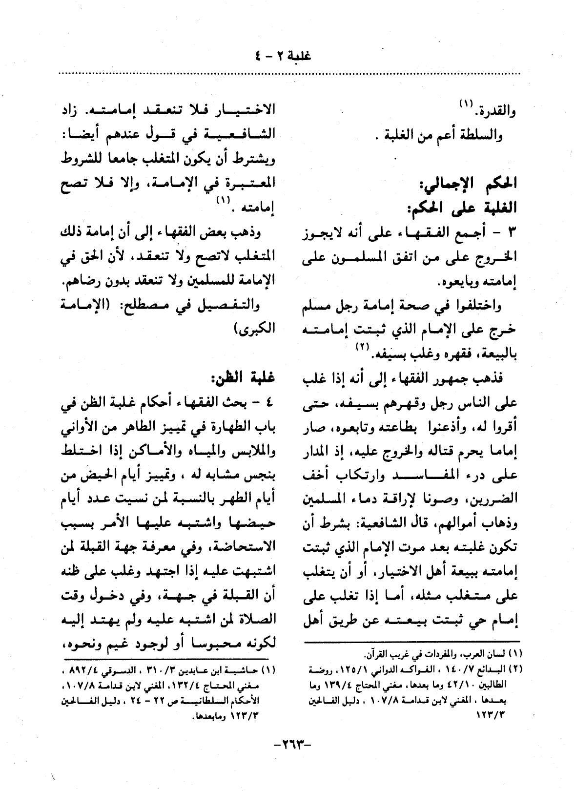 فَذَهَبَ جُمْهُورُ الْفُقَهَاءِ إِلَى أَنَّهُ إِذَا غَلَبَ عَلَى النَّاسِ رَجُلٌ وَقَهَرَهُمْ بِسَيْفِهِ، حَتَّى أَقَرُّوا لَهُ، وَأَذْعَنُوا بِطَاعَتِهِ وَتَابَعُوهُ، صَارَ إِمَامًا يَحْرُمُ قِتَالُهُ وَالْخُرُوجُ عَلَيْهِ، إِذِ الْمَدَارُ عَلَى دَرْءِ الْمَفَاسِدِ وَارْتِكَابِ أَخَفِّ الضَّرَرَيْنِ، وَصَوْنًا لإِِرَاقَةِ دِمَاءِ الْمُسْلِمِينَ وَذَهَابِ أَمْوَالِهِمْ، قَال الشَّافِعِيَّةُ: بِشَرْطِ أَنْ تَكُونَ غَلَبَتُهُ بَعْدَ مَوْتِ الإِْمَامِ الَّذِي ثَبَتَتْ إِمَامَتُهُ بِبَيْعَةِ أَهْل الاِخْتِيَارِ، أَوْ أَنْ يَتَغَلَّبَ عَلَى مُتَغَلِّبٍ مِثْلِهِ، أَمَّا إِذَا تَغَلَّبَ عَلَى إِمَامٍ حَيٍّ ثَبَتَتْ بَيْعَتُهُ عَنْ طَرِيقِ أَهْل