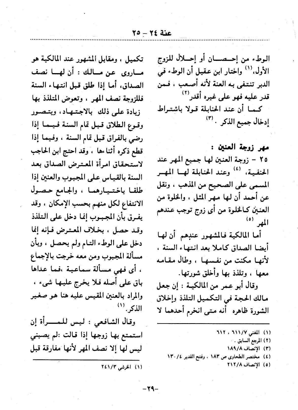 25 - زَوْجَةُ الْعِنِّينِ لَهَا جَمِيعُ الْمَهْرِ عِنْدَ الْحَنَفِيَّةِ (4) ، وَعِنْدَ الْحَنَابِلَةِ لَهَا الْمَهْرُ الْمُسَمَّى عَلَى الصَّحِيحِ مِنَ الْمَذْهَبِ، وَنُقِل عَنْ أَحْمَدَ أَنَّ لَهَا مَهْرَ الْمِثْل، وَالْخَلْوَةُ مِنْ الْعِنِّينِ كَالْخَلْوَةِ مِنْ أَيِّ زَوْجٍ تُوجِبُ عِنْدَهُمُ الْمَهْرَ (5)