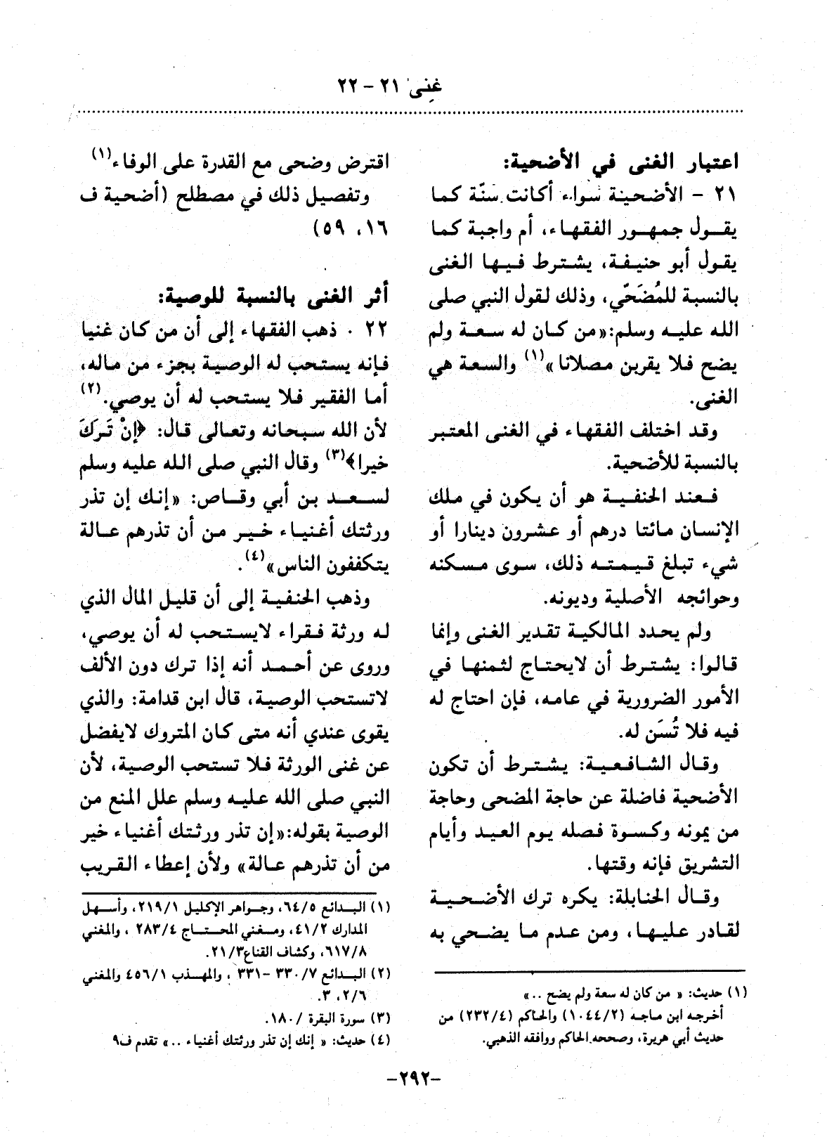 21 - الأُْضْحِيَّةُ سَوَاءٌ أَكَانَتْ سُنَّةً كَمَا يَقُول جُمْهُورُ الْفُقَهَاءِ، أَمْ وَاجِبَةً كَمَا يَقُول أَبُو حَنِيفَةَ، يُشْتَرَطُ فِيهَا الْغِنَى بِالنِّسْبَةِ لِلْمُضَحِّي، وَذَلِكَ لِقَوْل النَّبِيِّ صَلَّى اللَّهُ عَلَيْهِ وَسَلَّمَ: مَنْ كَانَ لَهُ سَعَةٌ وَلَمْ يُضَحِّ فَلاَ يَقْرَبَنَّ مُصَلاَّنَا (1) وَالسَّعَةُ هِيَ الْغِنَى.