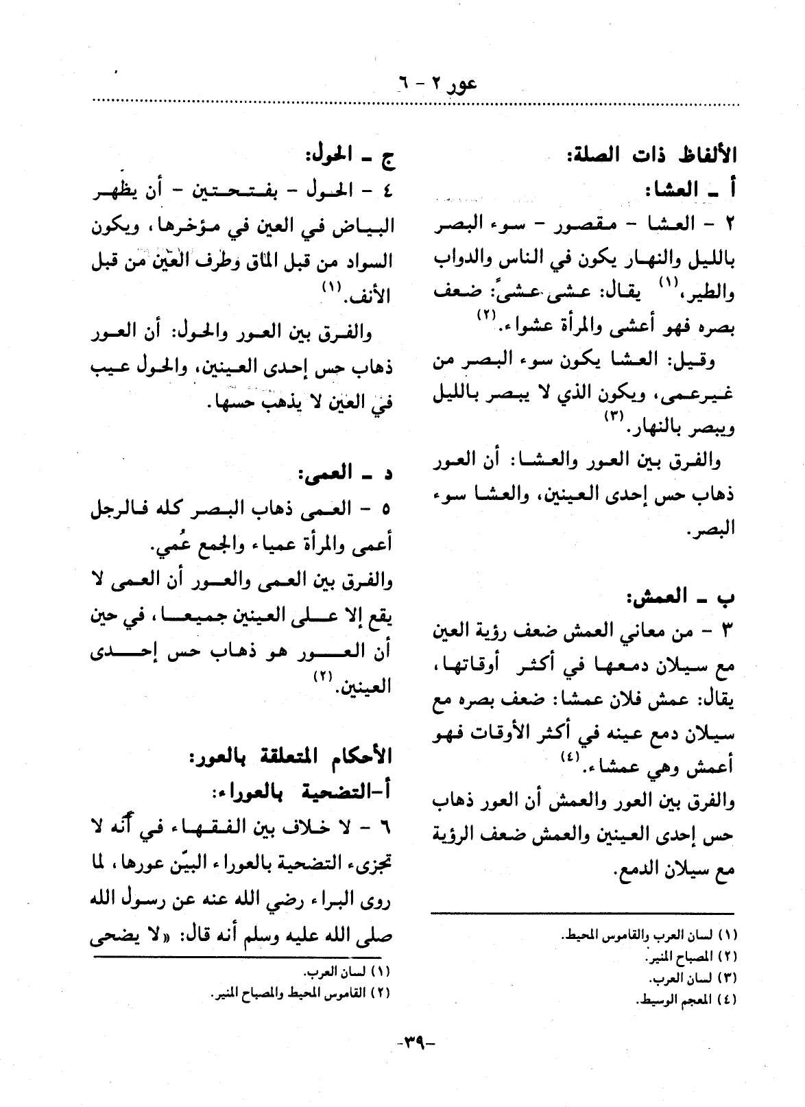5 - الْعَمَى ذَهَابُ الْبَصَرِ كُلِّهِ فَالرَّجُل أَعْمَى وَالْمَرْأَةُ عَمْيَاءُ وَالْجَمْعُ عُمْيٌ.