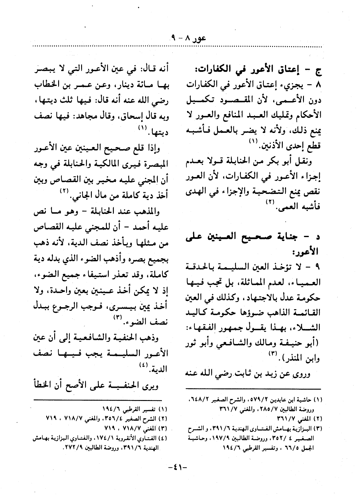 9 - لاَ تُؤْخَذُ الْعَيْنُ السَّلِيمَةُ بِالْحَدَقَةِ الْعَمْيَاءِ؛ لِعَدَمِ الْمُمَاثَلَةِ، بَل تَجِبُ فِيهَا حُكُومَةُ عَدْلٍ بِالاِجْتِهَادِ، وَكَذَلِكَ فِي الْعَيْنِ الْقَائِمَةِ الذَّاهِبِ ضَوْءُهَا حُكُومَةٌ كَالْيَدِ الشَّلاَّءِ، بِهَذَا يَقُول جُمْهُورُ الْفُقَهَاءِ: (أَبُو حَنِيفَةَ وَمَالِكٌ وَالشَّافِعِيُّ وَأَبُو ثَوْرٍ وَابْنُ الْمُنْذِرِ) . (3)