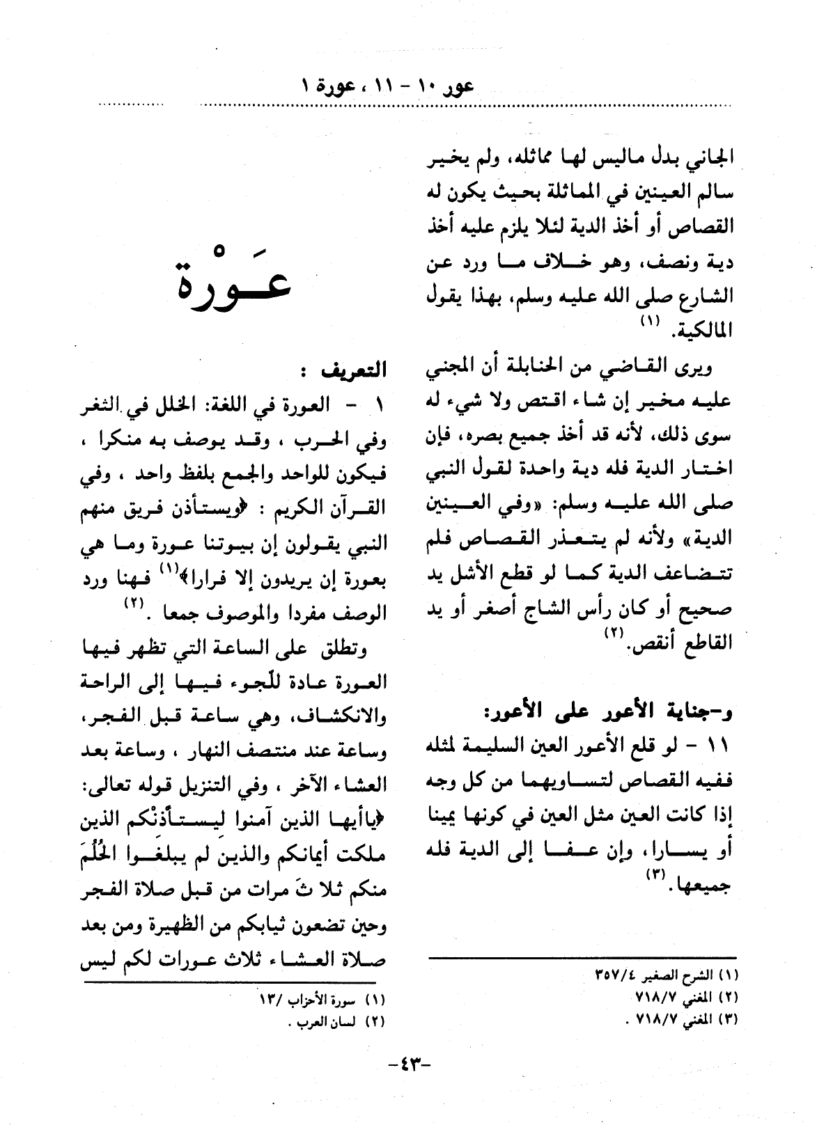 1 - الْعَوْرَةُ فِي اللُّغَةِ: الْخَلَل فِي الثَّغْرِ وَفِي الْحَرْبِ، وَقَدْ يُوصَفُ بِهِ مُنَكَّرًا، فَيَكُونُ لِلْوَاحِدِ وَالْجَمْعِ بِلَفْظٍ وَاحِدٍ. وَفِي الْقُرْآنِ الْكَرِيمِ: {وَيَسْتَأْذِنُ فَرِيقٌ مِنْهُمُ النَّبِيَّ يَقُولُونَ إِنَّ بُيُوتَنَا عَوْرَةٌ وَمَا هِيَ بِعَوْرَةٍ إِنْ يُرِيدُونَ إِلاَّ فِرَارًا} (1) فَهُنَا وَرَدَ الْوَصْفُ مُفْرَدًا وَالْمَوْصُوفُ جَمْعًا (2) .