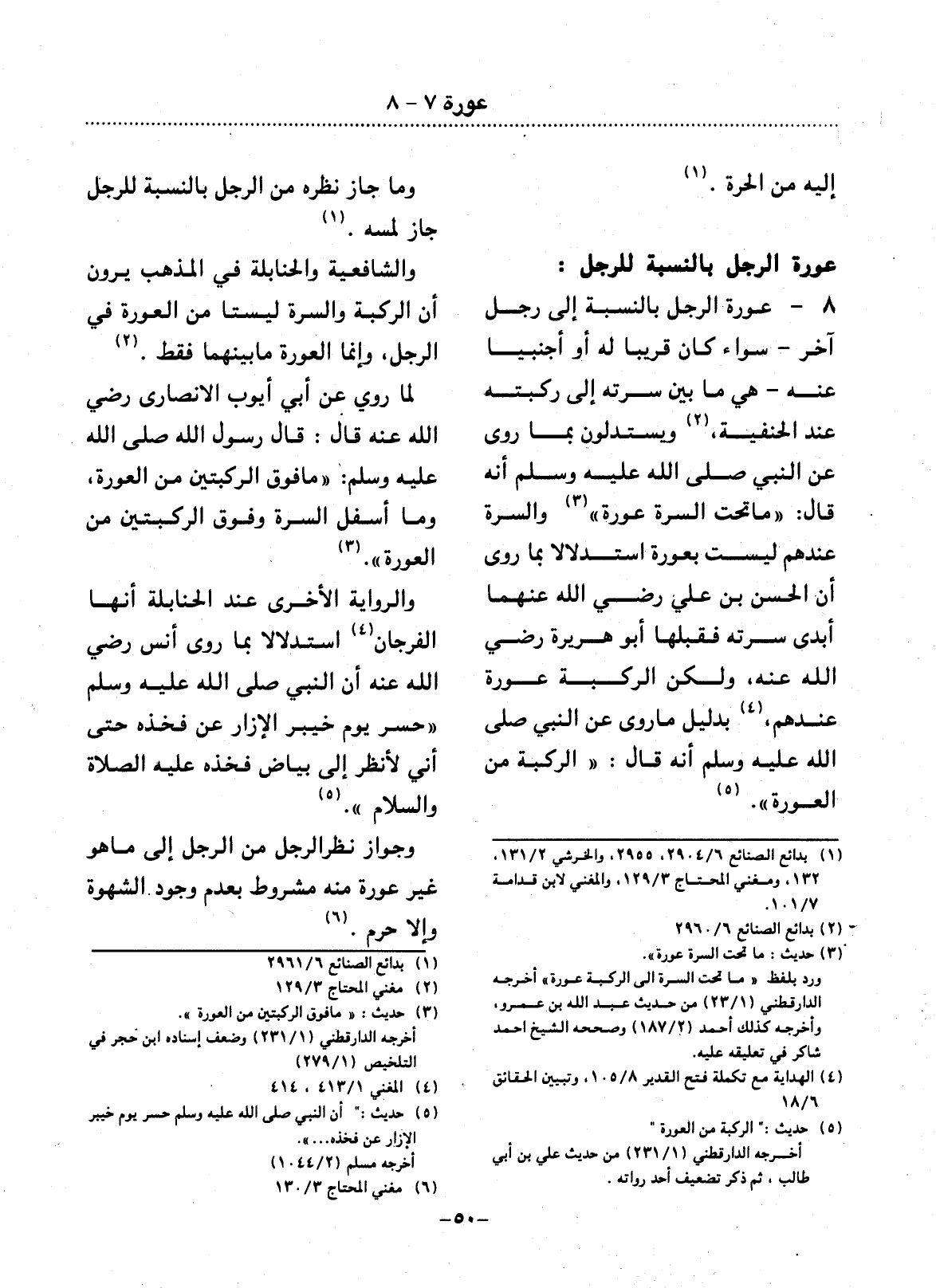 8 - عَوْرَةُ الرَّجُل بِالنِّسْبَةِ إِلَى رَجُلٍ آخَرَ - سَوَاءٌ كَانَ قَرِيبًا لَهُ أَوْ أَجْنَبِيًّا عَنْهُ - هِيَ مَا بَيْنَ سُرَّتِهِ إِلَى رُكْبَتِهِ عِنْدَ الْحَنَفِيَّةِ (2) ، وَيَسْتَدِلُّونَ بِمَا رُوِيَ عَنِ النَّبِيِّ صَلَّى اللَّهُ عَلَيْهِ وَسَلَّمَ أَنَّهُ قَال: مَا تَحْتَ السُّرَّةِ عَوْرَةٌ (3) وَالسُّرَّةُ عِنْدَهُمْ لَيْسَتْ بِعَوْرَةٍ اسْتِدْلاَلاً بِمَا رُوِيَ أَنَّ الْحَسَنَ بْنَ عَلِيٍّ رَضِيَ اللَّهُ عَنْهُمَا أَبْدَى سُرَّتَهُ فَقَبَّلَهَا أَبُو هُرَيْرَةَ رَضِيَ اللَّهُ عَنْهُ، وَلَكِنَّ الرُّكْبَةَ عَوْرَةٌ عِنْدَهُمْ (4) ، بِدَلِيل مَا رُوِيَ عَنِ النَّبِيِّ صَلَّى اللَّهُ عَلَيْهِ وَسَلَّمَ أَنَّهُ قَال: الرُّكْبَةُ مِنَ الْعَوْرَةِ. (5)