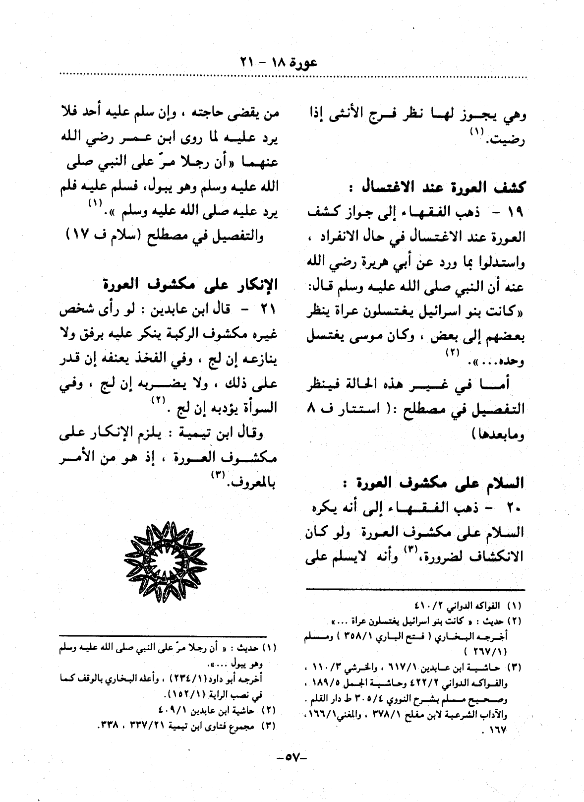 20 - ذَهَبَ الْفُقَهَاءُ إِلَى أَنَّهُ يُكْرَهُ السَّلاَمُ عَلَى مَكْشُوفِ الْعَوْرَةِ وَلَوْ كَانَ الاِنْكِشَافُ لِضَرُورَةٍ، (3) وَأَنَّهُ لاَ يُسَلِّمُ عَلَى