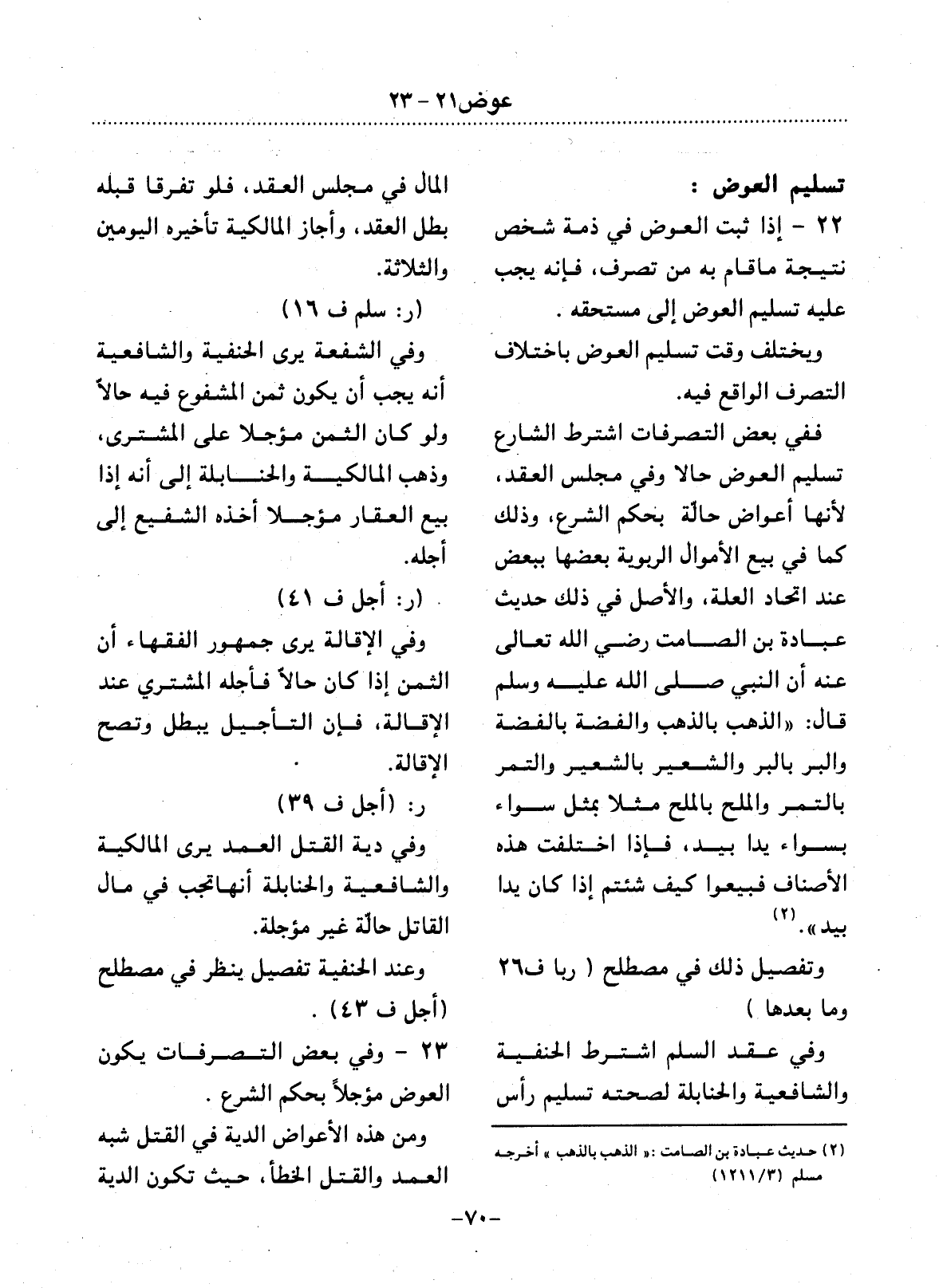 23 - وَفِي بَعْضِ التَّصَرُّفَاتِ يَكُونُ الْعِوَضُ مُؤَجَّلاً بِحُكْمِ الشَّرْعِ.