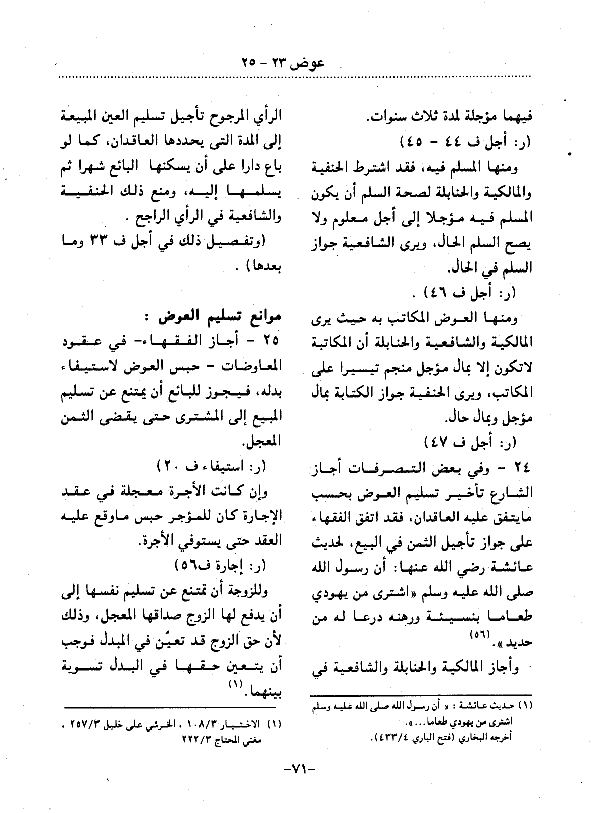 24 - وَفِي بَعْضِ التَّصَرُّفَاتِ أَجَازَ الشَّارِعُ تَأْخِيرَ تَسْلِيمِ الْعِوَضِ بِحَسَبِ مَا يَتَّفِقُ عَلَيْهِ الْعَاقِدَانِ، فَقَدِ اتَّفَقَ الْفُقَهَاءُ عَلَى جَوَازِ تَأْجِيل الثَّمَنِ فِي الْبَيْعِ، لِحَدِيثِ عَائِشَةَ رَضِيَ اللَّهُ عَنْهَا أَنَّ رَسُول اللَّهِ صَلَّى اللَّهُ عَلَيْهِ وَسَلَّمَ اشْتَرَى مِنْ يَهُودِيٍّ طَعَامًا بِنَسِيئَةٍ وَرَهَنَهُ دِرْعًا لَهُ مِنْ حَدِيدٍ. (1)