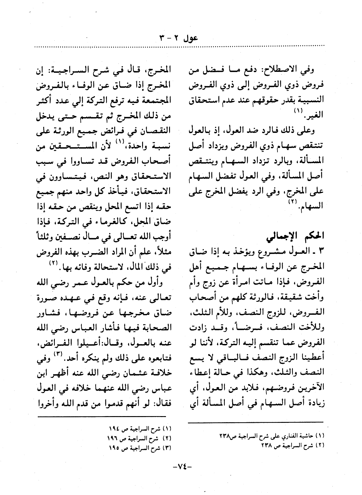 3 - الْعَوْل مَشْرُوعٌ وَيُؤْخَذُ بِهِ إِذَا ضَاقَ الْمُخْرَجُ عَنِ الْوَفَاءِ بِسِهَامِ جَمِيعِ أَهْل الْفُرُوضِ. فَإِذَا مَاتَتِ امْرَأَةٌ عَنْ زَوْجٍ وَأُمٍّ وَأُخْتٍ شَقِيقَةٍ، فَالْوَرَثَةُ كُلُّهُمْ مِنْ أَصْحَابِ الْفُرُوضِ، لِلزَّوْجِ النِّصْفُ، وَلِلأُْمِّ الثُّلُثُ، وَلِلأُْخْتِ النِّصْفُ، فَرْضًا، وَقَدْ زَادَتِ الْفُرُوضُ عَمَّا تَنْقَسِمُ إِلَيْهِ التَّرِكَةُ، لأَِنَّنَا لَوْ أَعْطَيْنَا الزَّوْجَ النِّصْفَ فَالْبَاقِي لاَ يَسَعُ النِّصْفَ وَالثُّلُثَ، وَهَكَذَا فِي حَالَةِ إِعْطَاءِ الآْخَرِينَ فُرُوضَهُمْ، فَلاَ بُدَّ مِنَ الْعَوْل، أَيْ زِيَادَةِ أَصْل السِّهَامِ فِي أَصْل الْمَسْأَلَةِ أَيْ