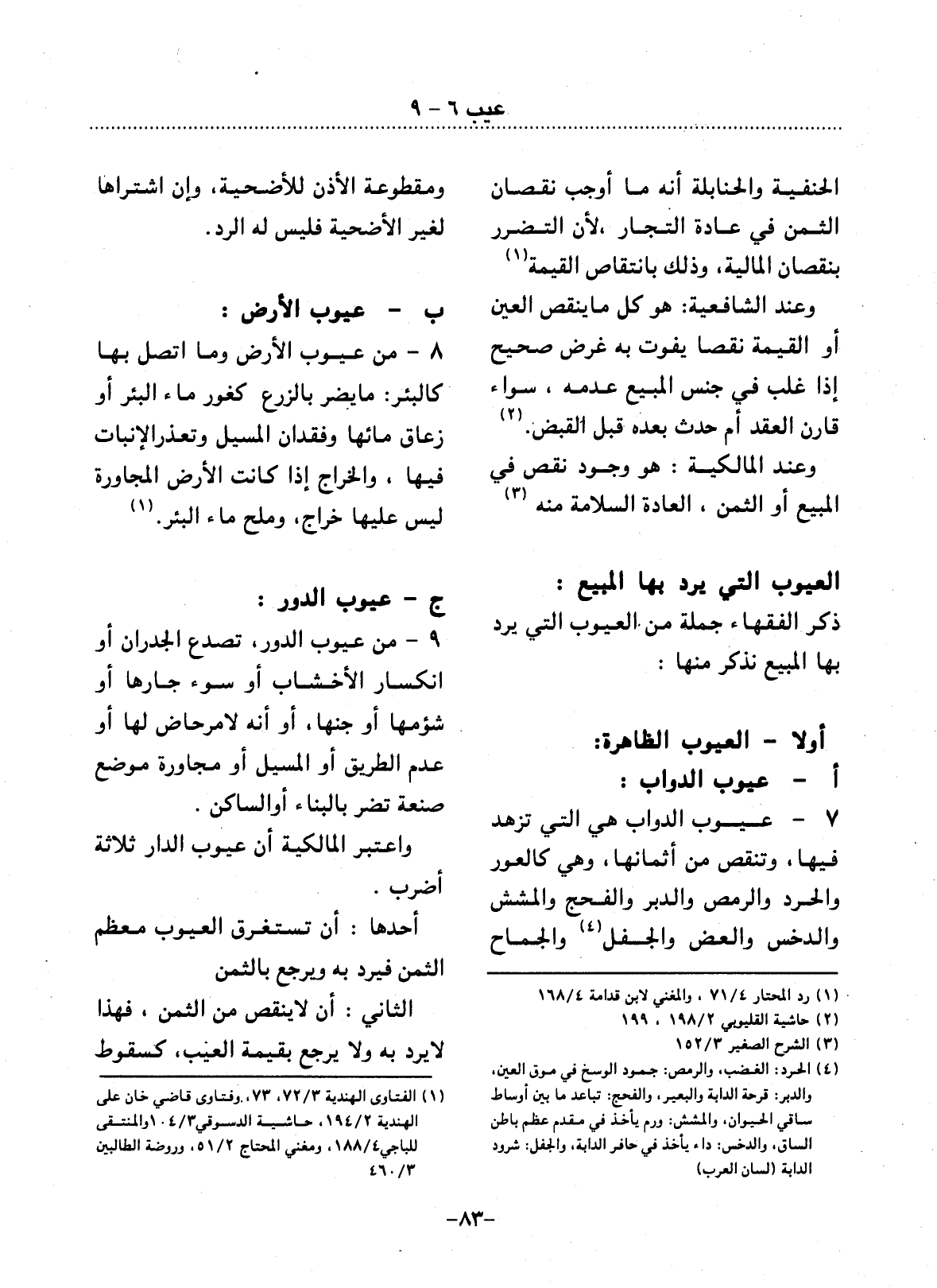 7 - عُيُوبُ الدَّوَابِّ هِيَ الَّتِي تُزَهِّدُ فِيهَا، وَتُنْقِصُ مِنْ أَثْمَانِهَا، وَهِيَ كَالْعَوَرِ وَالْحَرَدِ وَالرَّمَصِ وَالدَّبَرِ وَالْفَحَجِ وَالْمَشَشِ وَالدَّخَسِ وَالْعَضِّ وَالْجَفْل (4) وَالْجِمَاحِ