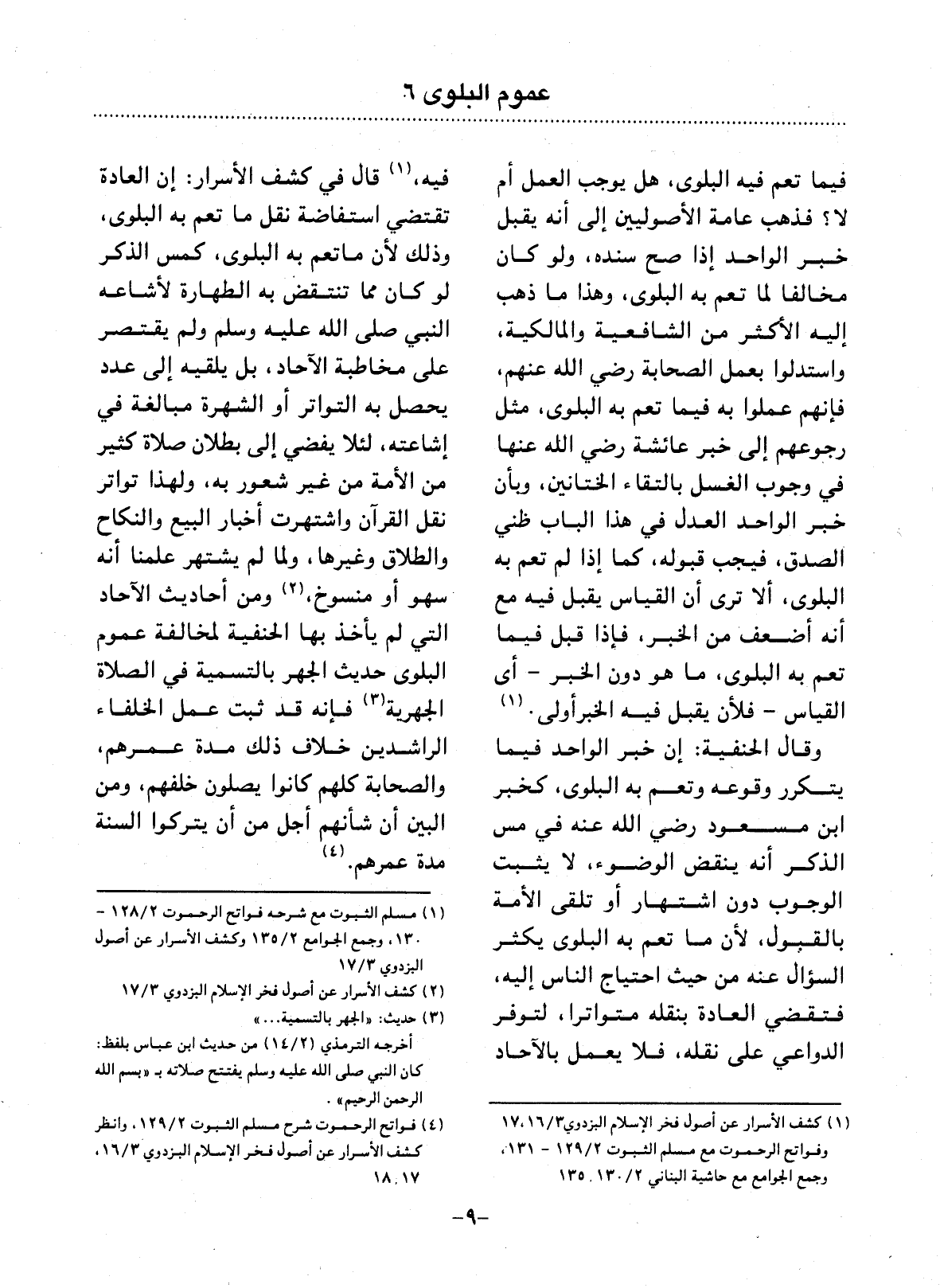 (4) فواتح الرحموت شرح مسلم الثبوت 2 / 129، وانظر كشف الأسرار عن أصول فخر الإسلام البزدوي 3 / 16، 17، 18.