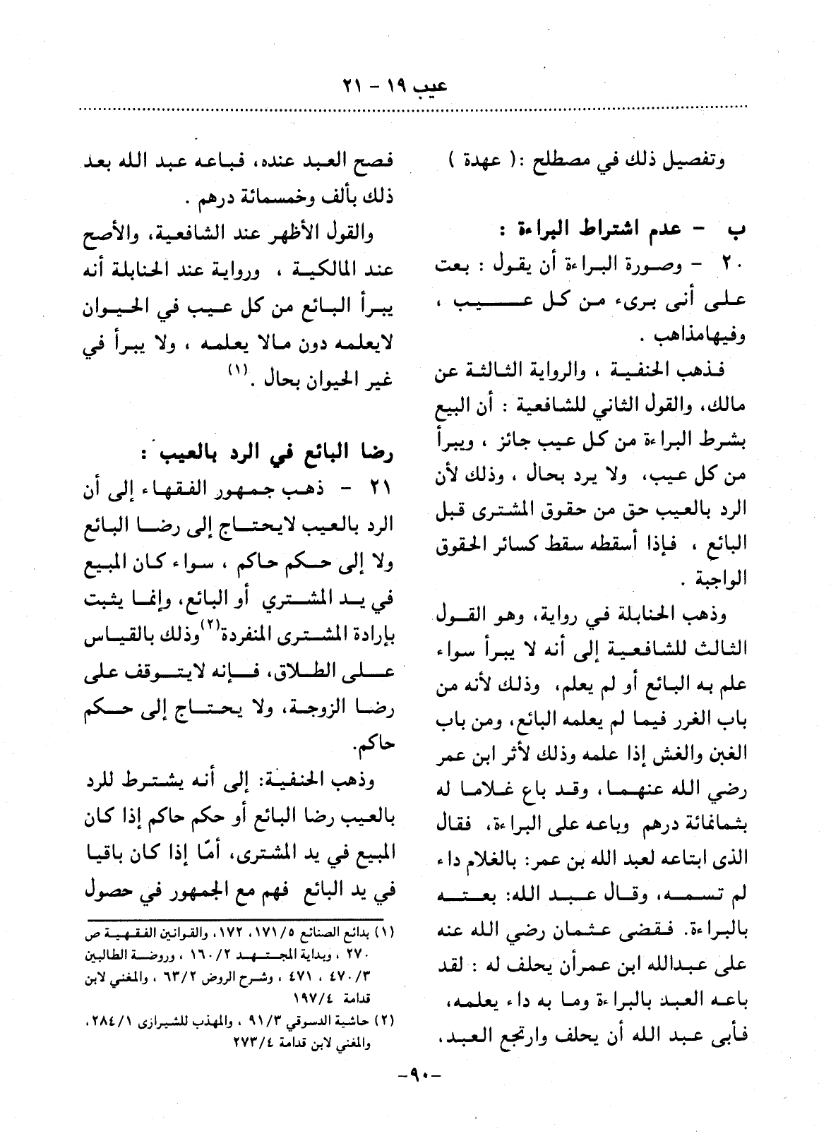20 - وَصُورَةُ الْبَرَاءَةِ أَنْ يَقُول: بِعْتُ عَلَى أَنِّي بَرِيءٌ مِنْ كُل عَيْبٍ، وَفِيهَا مَذَاهِبُ.
