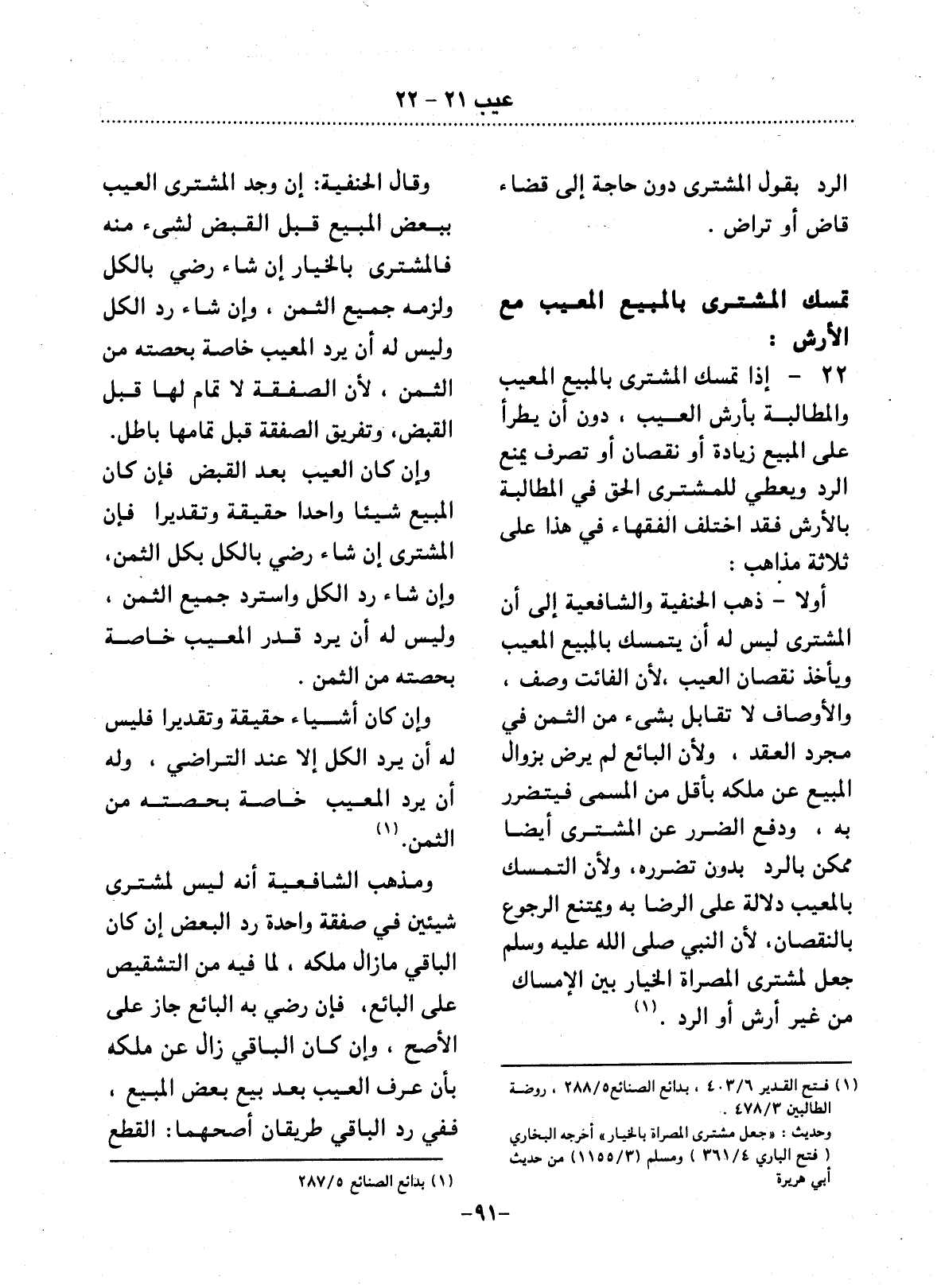 (1) فتح القدير 6 / 403، بدائع الصنائع 5 / 288، روضة الطالبين 3 / 478. . وحديث: " جعل مشتري المصراة بالخيار ". . أخرجه البخاري (فتح الباري 4 / 361) ومسلم (3 / 1155) من حديث أبي هريرة.