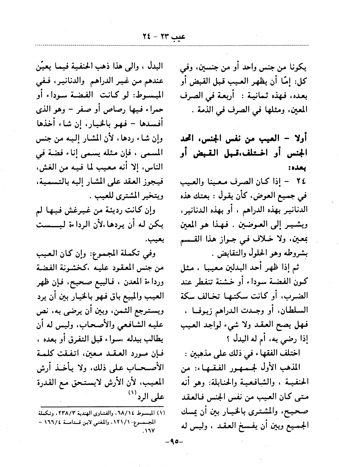 24 - إِذَا كَانَ الصَّرْفُ مُعَيَّنًا وَالْعَيْبُ فِي جَمِيعِ الْعِوَضِ، كَأَنْ يَقُول بِعْتُكَ هَذِهِ الدَّنَانِيرَ بِهَذِهِ الدَّرَاهِمِ، أَوْ بِهَذِهِ الدَّنَانِيرِ، وَيُشِيرُ إِلَى الْعِوَضَيْنِ. فَهَذَا هُوَ الْمُعَيَّنُ بِمُعَيَّنٍ، وَلاَ خِلاَفَ فِي جَوَازِ هَذَا الْقِسْمِ بِشُرُوطِهِ وَهُوَ الْحُلُول وَالتَّقَابُضُ.