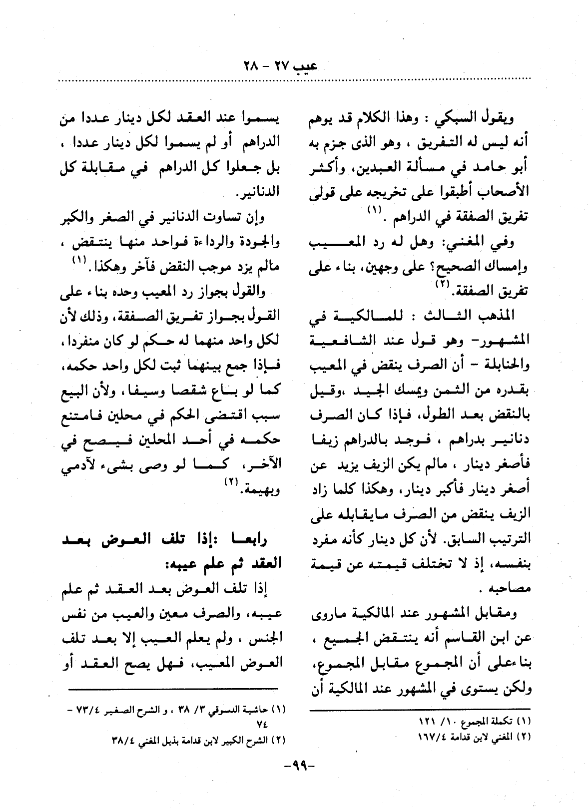 رَابِعًا إِذَا تَلِفَ الْعِوَضُ بَعْدَ الْعَقْدِ ثُمَّ عَلِمَ عَيْبَهُ: