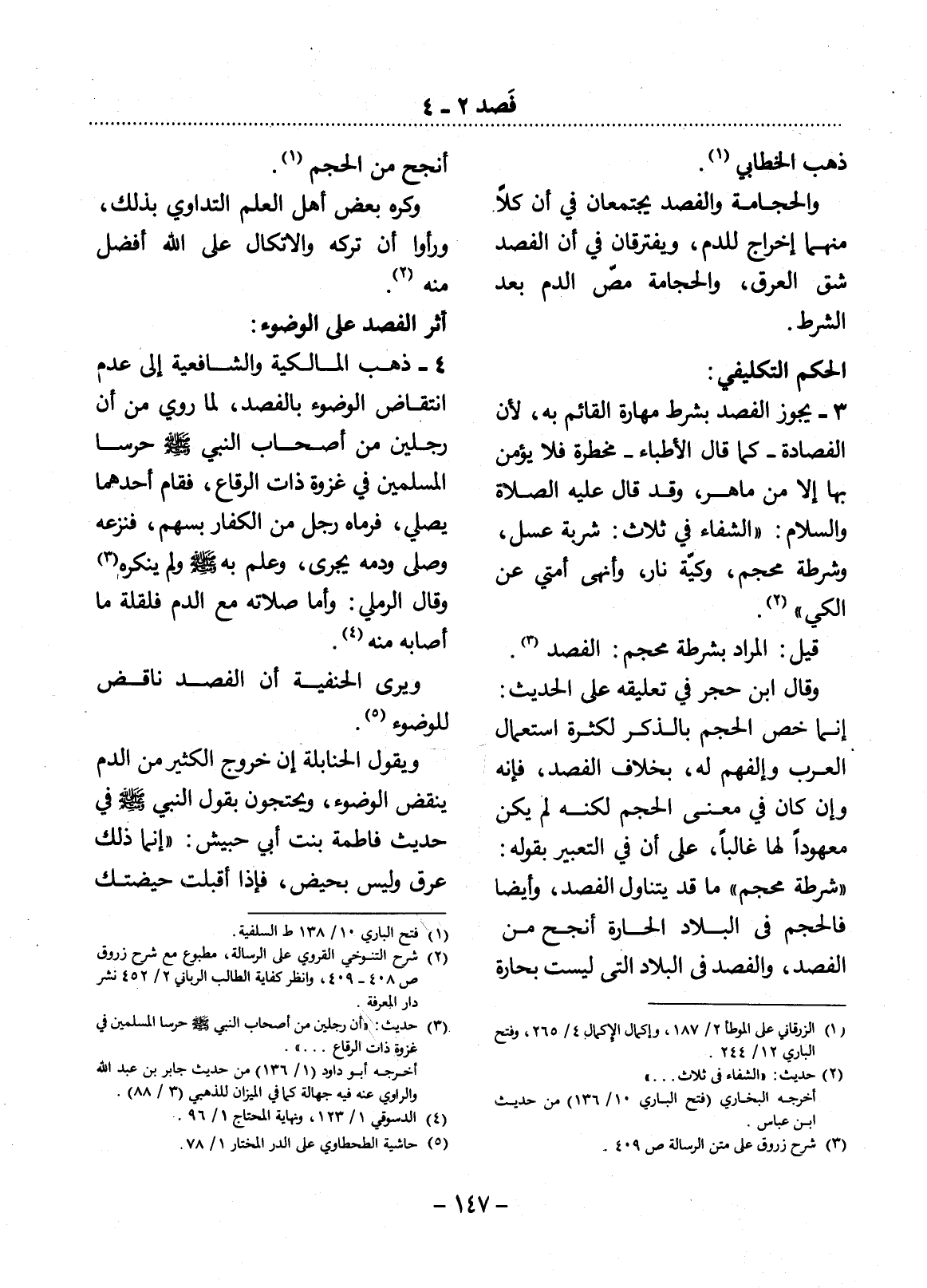 4 - ذَهَبَ الْمَالِكِيَّةُ وَالشَّافِعِيَّةُ إِلَى عَدَمِ انْتِقَاضِ الْوُضُوءِ بِالْفَصْدِ، لِمَا رُوِيَ مِنْ أَنَّ رَجُلَيْنِ مِنْ أَصْحَابِ النَّبِيِّ حَرَسَا الْمُسْلِمِينَ فِي غَزْوَةِ ذَاتِ الرِّقَاعِ، فَقَامَ أَحَدُهُمَا يُصَلِّي فَرَمَاهُ رَجُلٌ مِنَ الْكُفَّارِ بِسَهْمٍ فَنَزَعَهُ وَصَلَّى وَدَمُهُ يَجْرِي، وَعَلِمَ بِهِ صَلَّى اللَّهُ عَلَيْهِ وَسَلَّمَ وَلَمْ يُنْكِرْهُ (3) قَال الرَّمْلِيُّ: وَأَمَّا صَلاَتُهُ مَعَ الدَّمِ فَلِقِلَّةِ مَا أَصَابَهُ مِنْهُ (4) .
