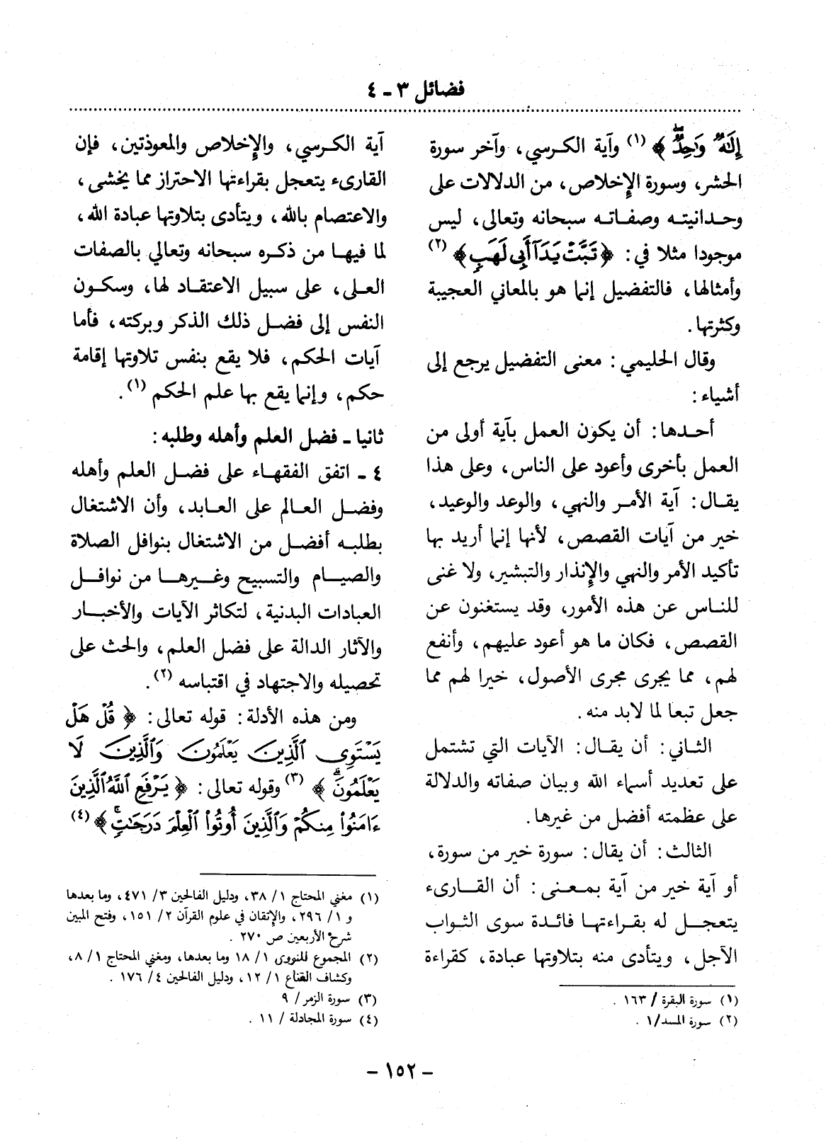 إِلَهٌ وَاحِدٌ} (1) وَآيَةُ الْكُرْسِيِّ، وَآخِرُ سُورَةِ الْحَشْرِ، وَسُورَةُ الإِْخْلاَصِ، مِنَ الدَّلاَلاَتِ عَلَى وَحْدَانِيِّتِهِ وَصِفَاتِهِ سُبْحَانَهُ وَتَعَالَى، لَيْسَ مَوْجُودًا مَثَلاً فِي: {تَبَّتْ يَدَا أَبِي لَهَبٍ} (2) وَأَمْثَالِهَا، فَالتَّفْضِيل إِنَّمَا هُوَ بِالْمَعَانِي الْعَجِيبَةِ وَكَثْرَتِهَا.