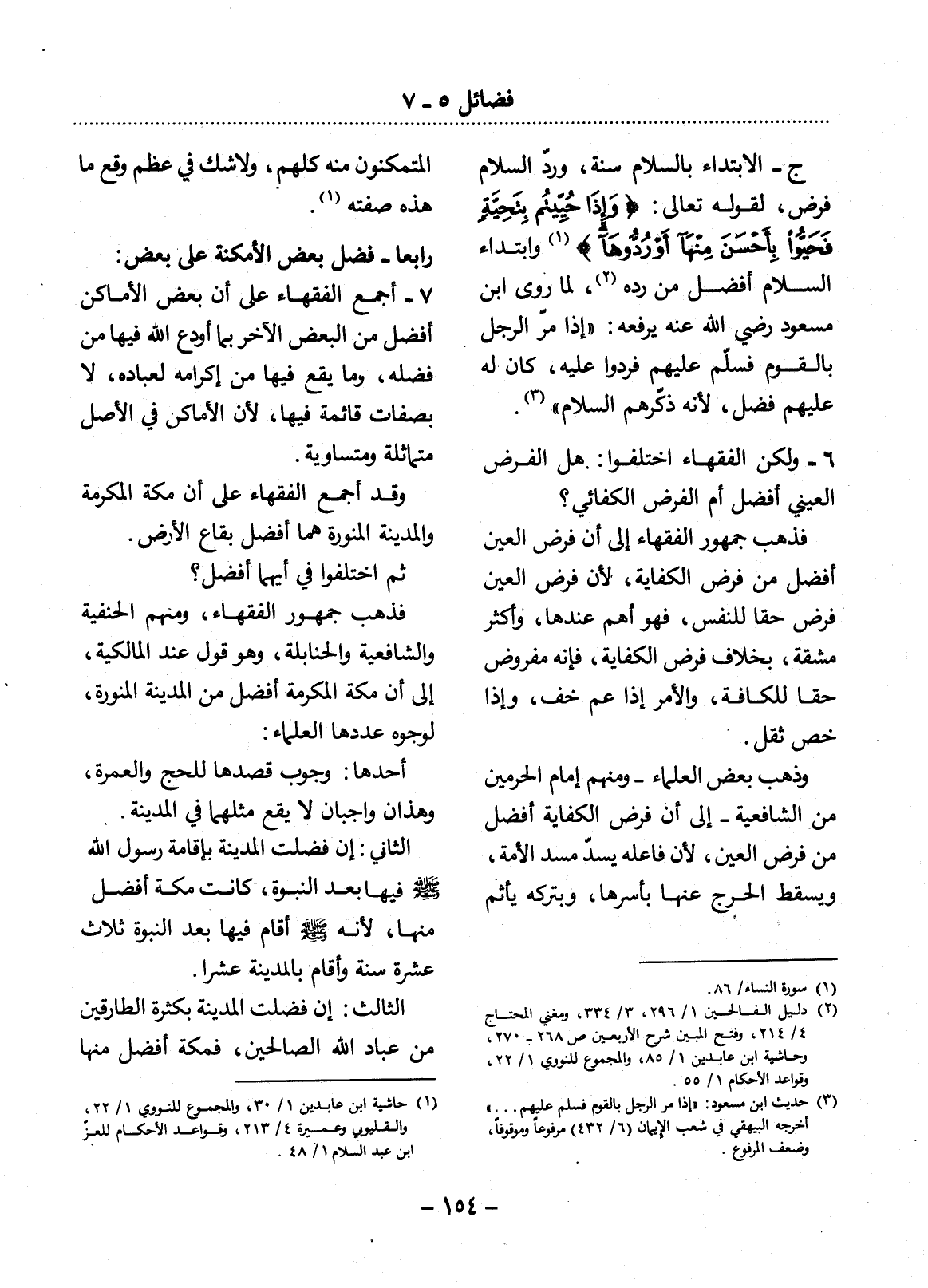 وَقَدْ أَجْمَعَ الْفُقَهَاءُ عَلَى أَنَّ مَكَّةَ الْمُكَرَّمَةَ وَالْمَدِينَةَ الْمُنَوَّرَةَ هُمَا أَفْضَل بِقَاعِ الأَْرْضِ. ثُمَّ اخْتَلَفُوا فِي أَيِّهِمَا أَفْضَل؟ فَذَهَبَ جُمْهُورُ الْفُقَهَاءِ، مِنْهُمُ الْحَنَفِيَّةُ وَالشَّافِعِيَّةُ وَالْحَنَابِلَةُ، وَهُوَ قَوْلٌ عِنْدَ الْمَالِكِيَّةِ، إِلَى أَنَّ مَكَّةَ الْمُكَرَّمَةَ أَفْضَل مِنَ الْمَدِينَةِ الْمُنَوَّرَةِ، لِوُجُوهٍ عَدَّدَهَا الْعُلَمَاءُ: