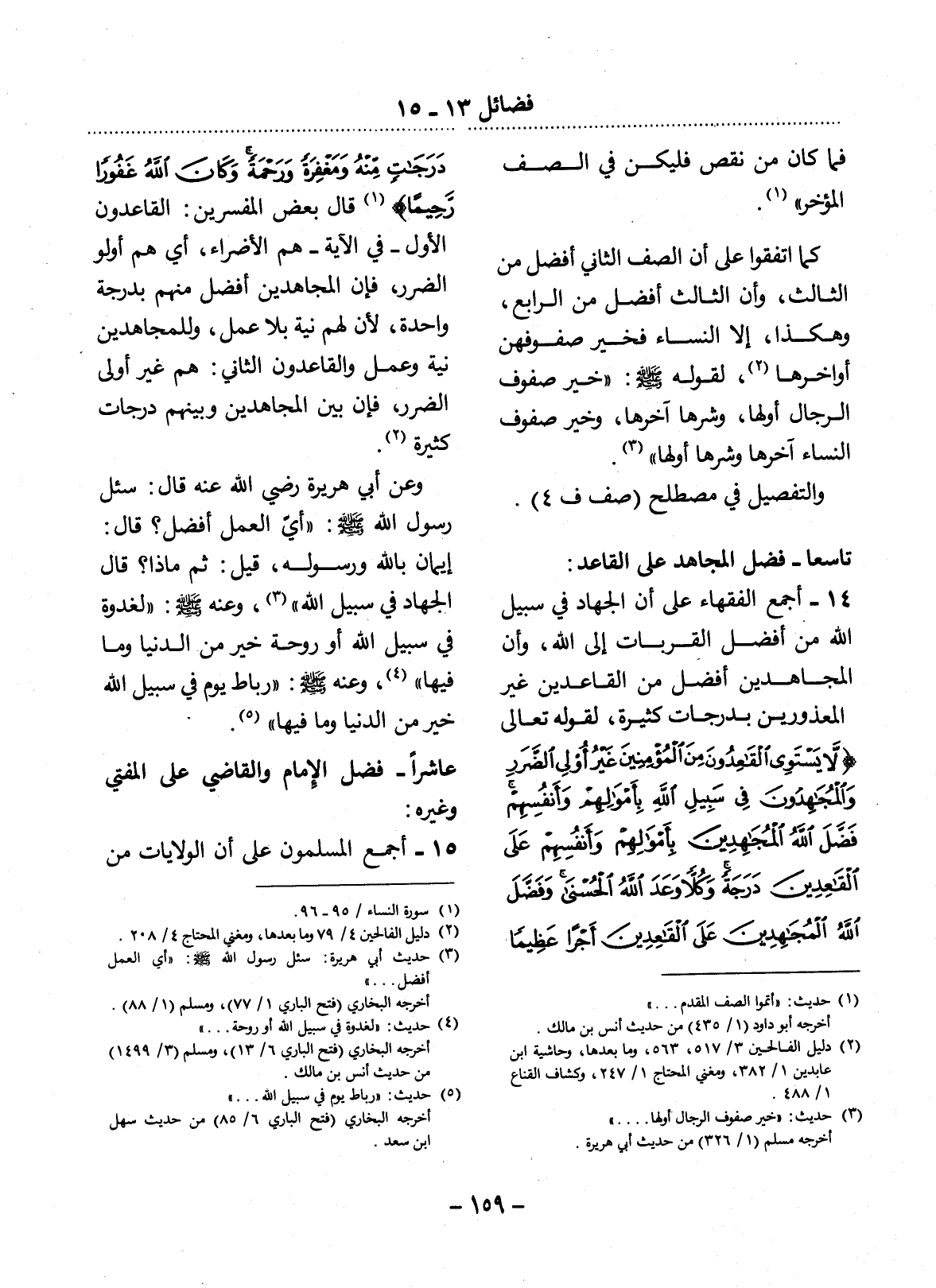 14 - أَجْمَعَ الْفُقَهَاءُ عَلَى أَنَّ الْجِهَادَ فِي سَبِيل اللَّهِ مِنْ أَفْضَل الْقُرُبَاتِ إِلَى اللَّهِ، وَأَنَّ الْمُجَاهِدِينَ أَفْضَل مِنَ الْقَاعِدِينَ غَيْرِ الْمَعْذُورِينَ بِدَرَجَاتٍ كَثِيرَةٍ، لِقَوْلِهِ تَعَالَى {لاَ يَسْتَوِي الْقَاعِدُونَ مِنَ الْمُؤْمِنِينَ غَيْرُ أُولِي الضَّرَرِ وَالْمُجَاهِدُونَ فِي سَبِيل اللَّهِ بِأَمْوَلِهِمْ وَأَنْفُسِهِمْ فَضَّل اللَّهُ الْمُجَاهِدِينَ بِأَمْوَالِهِمْ وَأَنْفُسِهِمْ عَلَى الْقَاعِدِينَ دَرَجَةً وَكُلًّا وَعَدَ اللَّهُ الْحُسْنَى وَفَضَّل اللَّهُ الْمُجَاهِدِينَ عَلَى الْقَاعِدِينَ أَجْرًا عَظِيمًا