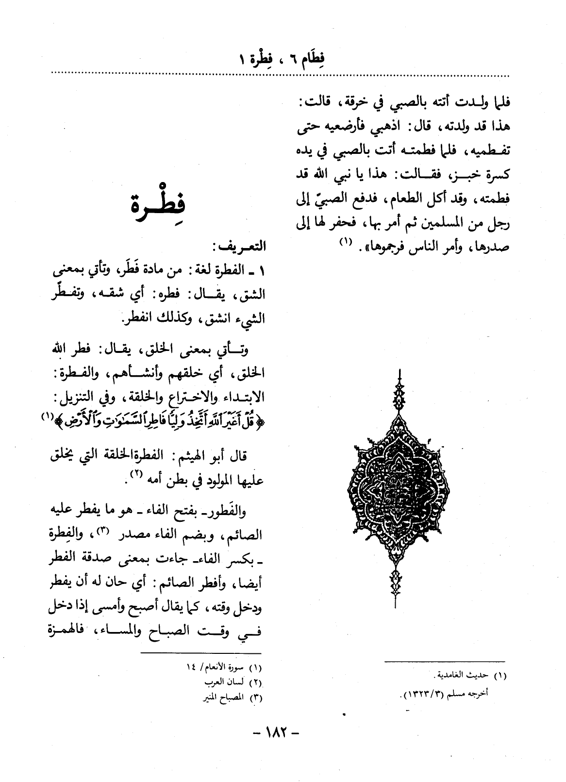 قَال أَبُو الْهَيْثَمِ: الْفِطْرَةُ الْخِلْقَةُ الَّتِي يُخْلَقُ عَلَيْهَا الْمَوْلُودُ فِي بَطْنِ أُمِّهِ. (2)