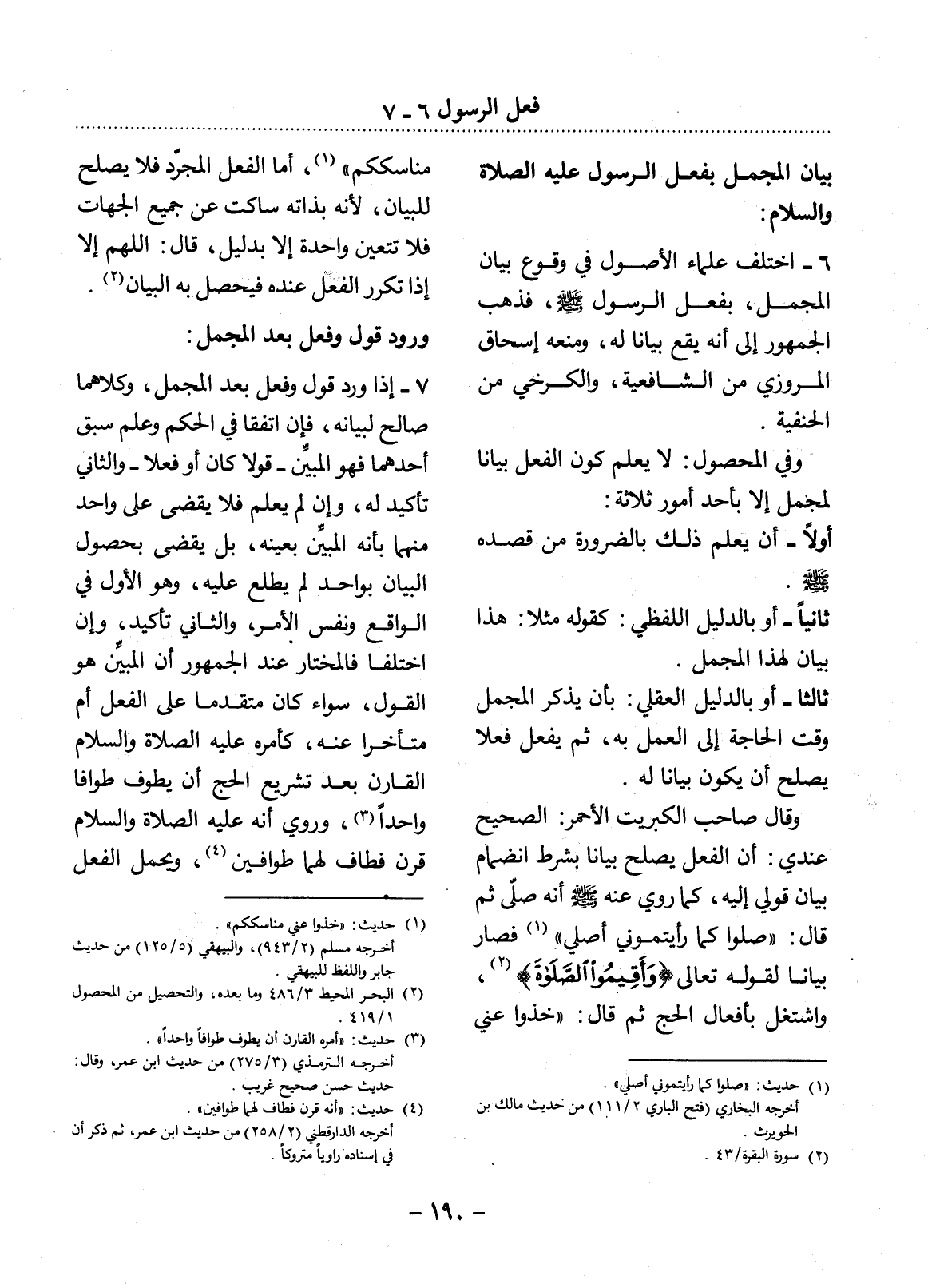 6 - اخْتَلَفَ عُلَمَاءُ الأُْصُول فِي وُقُوعِ بَيَانِ الْمُجْمَل بِفِعْل الرَّسُول صَلَّى اللَّهُ عَلَيْهِ وَسَلَّمَ، فَذَهَبَ الْجُمْهُورُ إِلَى أَنَّهُ يَقَعُ بَيَانًا لَهُ، وَمَنَعَهُ إِسْحَاقُ الْمَرْوَزِيُّ مِنَ الشَّافِعِيَّةِ، وَالْكَرْخِيُّ مِنَ الْحَنَفِيَّةِ.