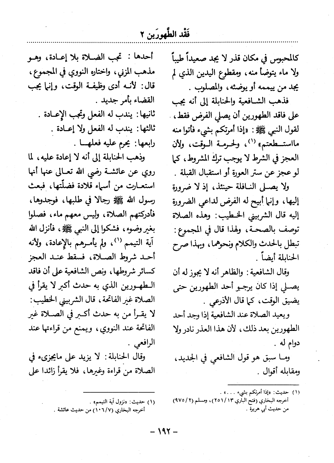 وَذَهَبَ الْحَنَابِلَةُ إِلَى أَنَّهُ لاَ إِعَادَةَ عَلَيْهِ، لِمَا رُوِيَ عَنْ عَائِشَةَ رَضِيَ اللَّهُ تَعَالَى عَنْهَا أَنَّهَا اسْتَعَارَتْ مِنْ أَسْمَاءَ قِلاَدَةً فَضَلَّتْهَا، فَبَعَثَ رَسُول اللَّهِ صَلَّى اللَّهُ عَلَيْهِ وَسَلَّمَ رِجَالاً فِي طَلَبِهَا فَوَجَدُوهَا، فَأَدْرَكَتْهُمُ الصَّلاَةُ وَلَيْسَ مَعَهُمْ مَاءٌ فَصَلَّوْا بِغَيْرِ وُضُوءٍ، فَشَكَوْا إِلَى النَّبِيِّ صَلَّى اللَّهُ عَلَيْهِ وَسَلَّمَ فَأَنْزَل اللَّهُ آيَةَ التَّيَمُّمِ (1) ، وَلَمْ يَأْمُرْهُمْ بِالإِْعَادَةِ، وَلأَِنَّهُ أَحَدُ شُرُوطِ الصَّلاَةِ، فَسَقَطَ عِنْدَ الْعَجْزِ كَسَائِرِ شُرُوطِهَا، وَنَصَّ الشَّافِعِيَّةُ عَلَى أَنَّ فَاقِدَ الطَّهُورَيْنِ الَّذِي بِهِ حَدَثٌ أَكْبَرُ لاَ يَقْرَأُ فِي الصَّلاَةِ غَيْرَ الْفَاتِحَةِ، قَال الشِّرْبِينِيُّ الْخَطِيبُ: لاَ يَقْرَأُ مَنْ بِهِ حَدَثٌ أَكْبَرُ فِي الصَّلاَةِ غَيْرَ الْفَاتِحَةِ عِنْدَ النَّوَوِيِّ، وَيُمْنَعُ مِنْ قِرَاءَتِهَا عِنْدَ الرَّافِعِيِّ.