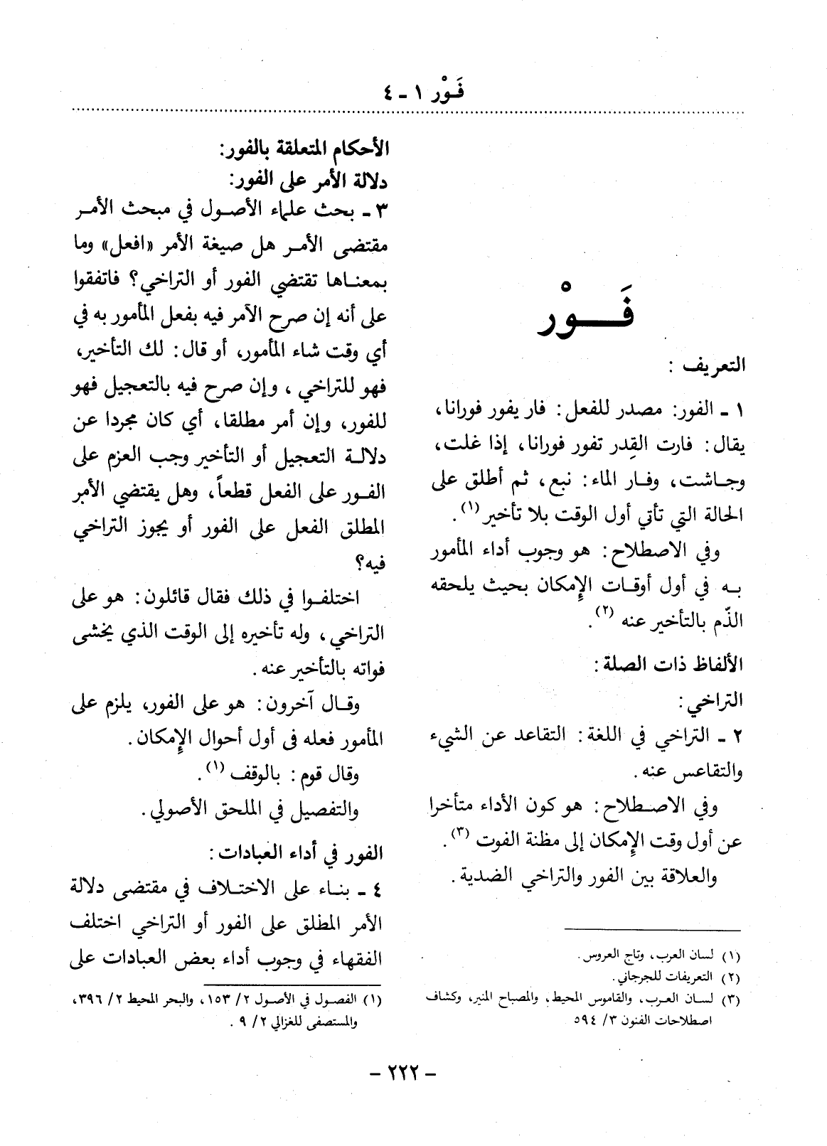 1 - الْفَوْرُ: مَصْدَرٌ لِلْفِعْل: فَارَ يَفُورُ فَوَرَانًا، يُقَال: فَارَتِ الْقِدْرُ تَفُورُ فَوَرَانًا، إذَا غَلَتْ، وَجَاشَتْ، وَفَارَ الْمَاءُ: نَبَعَ، ثُمَّ أُطْلِقَ عَلَى الْحَالَةِ الَّتِي تَأْتِي أَوَّل الْوَقْتِ بِلاَ تَأْخِيرٍ. (1)