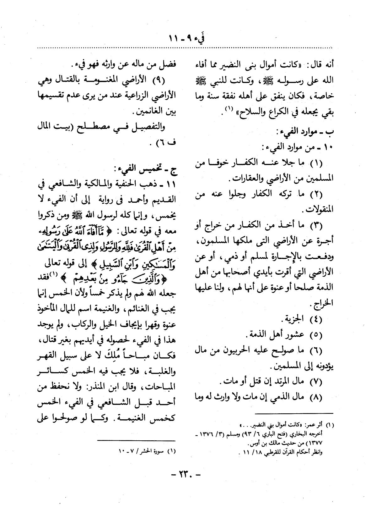 (1) أثر عمر: " كانت أموال بني النضير. . . ". أخرجه البخاري (فتح الباري 6 / 93) ومسلم (3 / 1376 - 1377) من حديث مالك بن أوس. وانظر أحكام القرآن للقرطبي 18 / 11.