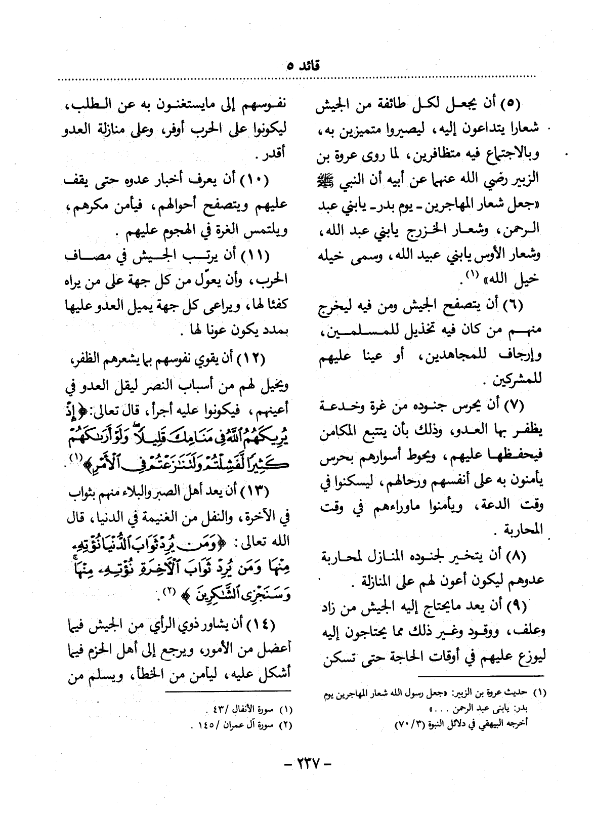 (5) أَنْ يَجْعَل لِكُل طَائِفَةٍ مِنَ الْجَيْشِ شِعَارًا يَتَدَاعَوْنَ إلَيْهِ، لِيَصِيرُوا مُتَمَيِّزِينَ بِهِ، وَبِالاِجْتِمَاعِ فِيهِ مُتَظَافِرِينَ، لِمَا رَوَى عُرْوَةُ بْنُ الزُّبَيْرِ رَضِيَ اللَّهُ عَنْهُمَا عَنْ أَبِيهِ أَنَّ النَّبِيَّ صَلَّى اللَّهُ عَلَيْهِ وَسَلَّمَ جَعَل شِعَارَ الْمُهَاجِرِينَ - يَوْمَ بَدْرٍ - يَا بَنِي عَبْدِ الرَّحْمَنِ، وَشِعَارَ الْخَزْرَجِ يَا بَنِي عَبْدِ اللَّهِ، وَشِعَارَ الأَْوْسِ يَا بَنِي عُبَيْدِ اللَّهِ، وَسَمَّى خَيْلَهُ خَيْل اللَّهِ (1) .