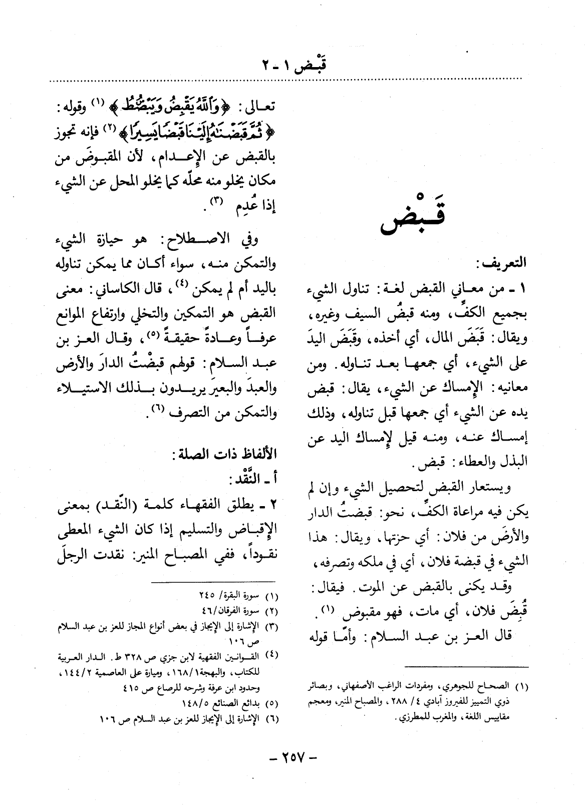 : {وَاَللَّهُ يَقْبِضُ وَيَبْسُطُ} (1) وَقَوْلُهُ: {ثُمَّ قَبَضْنَاهُ إلَيْنَا قَبْضًا يَسِيرًا} (2) فَإِنَّهُ تَجَوُّزٌ بِالْقَبْضِ عَنِ الإِْعْدَامِ، لأَِنَّ الْمَقْبُوضَ مِنْ مَكَانٍ يَخْلُو مِنْهُ مَحَلُّهُ كَمَا يَخْلُو الْمَحَل عَنِ الشَّيْءِ إذَا عُدِمَ (3) .