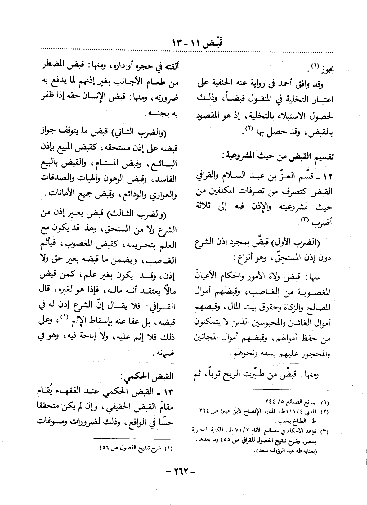 12 - قَسَّمَ الْعِزُّ بْنُ عَبْدِ السَّلاَمِ وَالْقَرَافِيُّ الْقَبْضَ كَتَصَرُّفٍ مِنْ تَصَرُّفَاتِ الْمُكَلَّفِينَ مِنْ حَيْثُ مَشْرُوعِيَّتُهُ وَالإِْذْنُ فِيهِ إلَى ثَلاَثَةِ أَضْرُبٍ (3) .