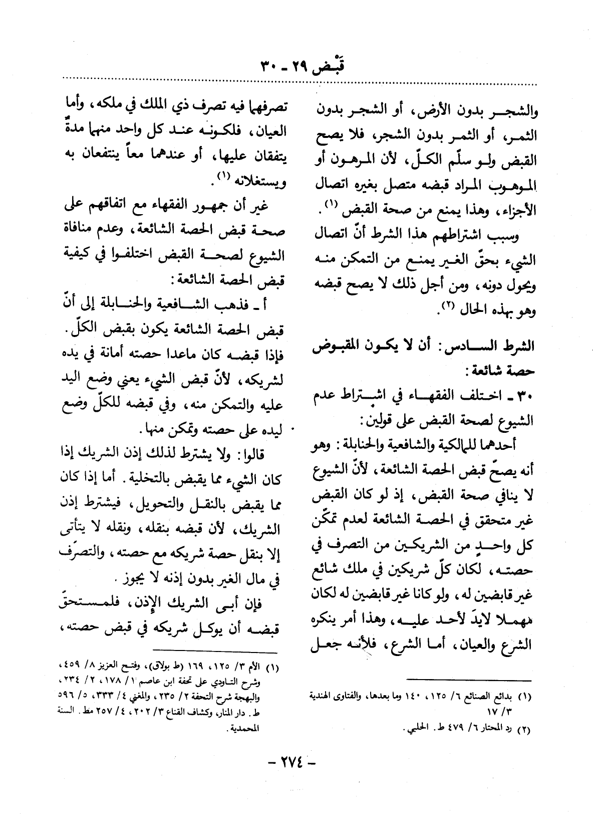 30 - اخْتَلَفَ الْفُقَهَاءُ فِي اشْتِرَاطِ عَدَمِ الشُّيُوعِ لِصِحَّةِ الْقَبْضِ عَلَى قَوْلَيْنِ: