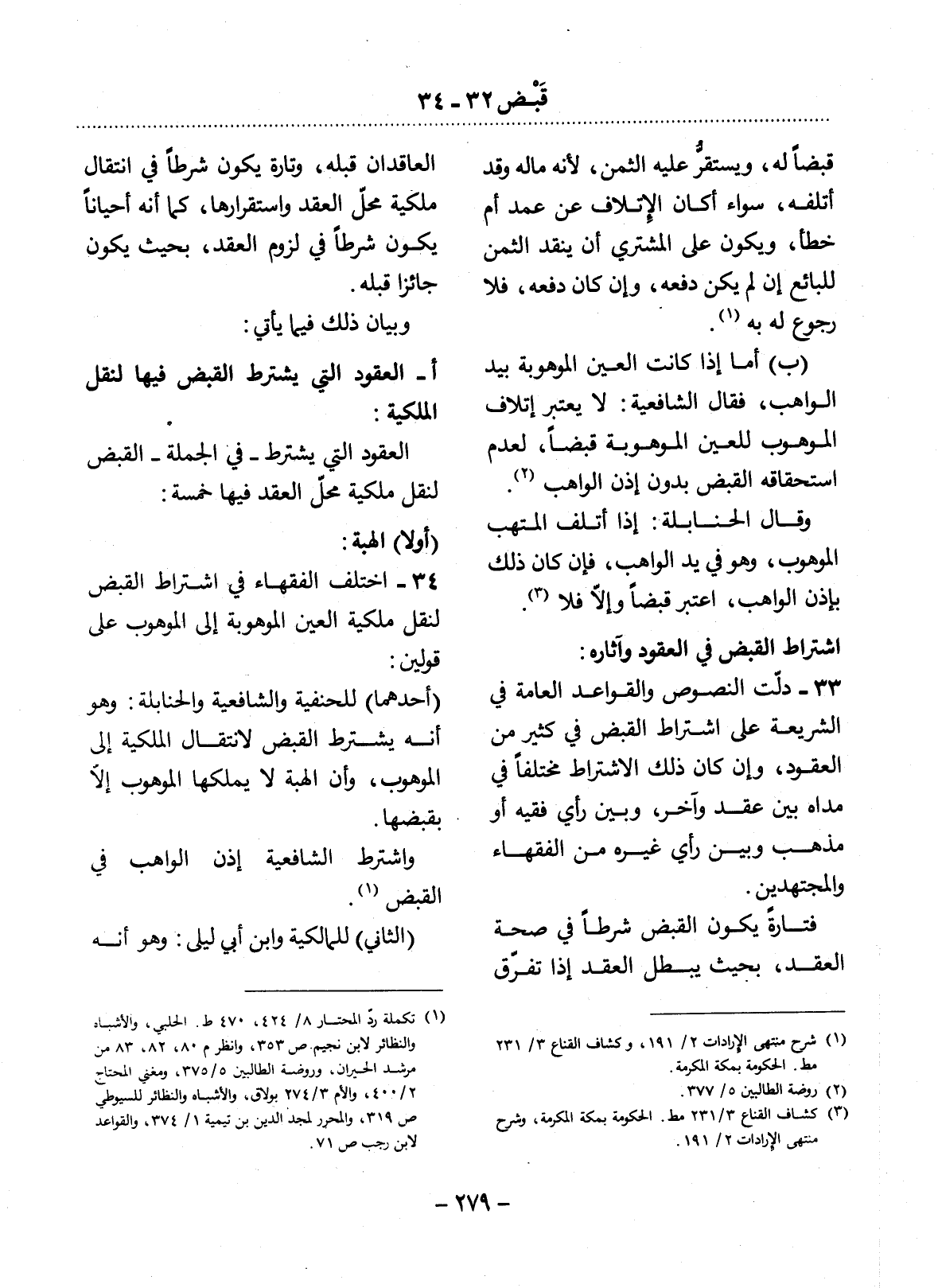 33 - دَلَّتِ النُّصُوصُ وَالْقَوَاعِدُ الْعَامَّةُ فِي الشَّرِيعَةِ عَلَى اشْتِرَاطِ الْقَبْضِ فِي كَثِيرٍ مِنَ الْعُقُودِ، وَإِنْ كَانَ ذَلِكَ الاِشْتِرَاطُ مُخْتَلَفًا فِي مَدَاهُ بَيْنَ عَقْدٍ وَآخَرَ، وَبَيْنَ رَأْيِ فَقِيهٍ أَوْ مَذْهَبٍ وَبَيْنَ رَأْيِ غَيْرِهِ مِنَ الْفُقَهَاءِ وَالْمُجْتَهِدِينَ.