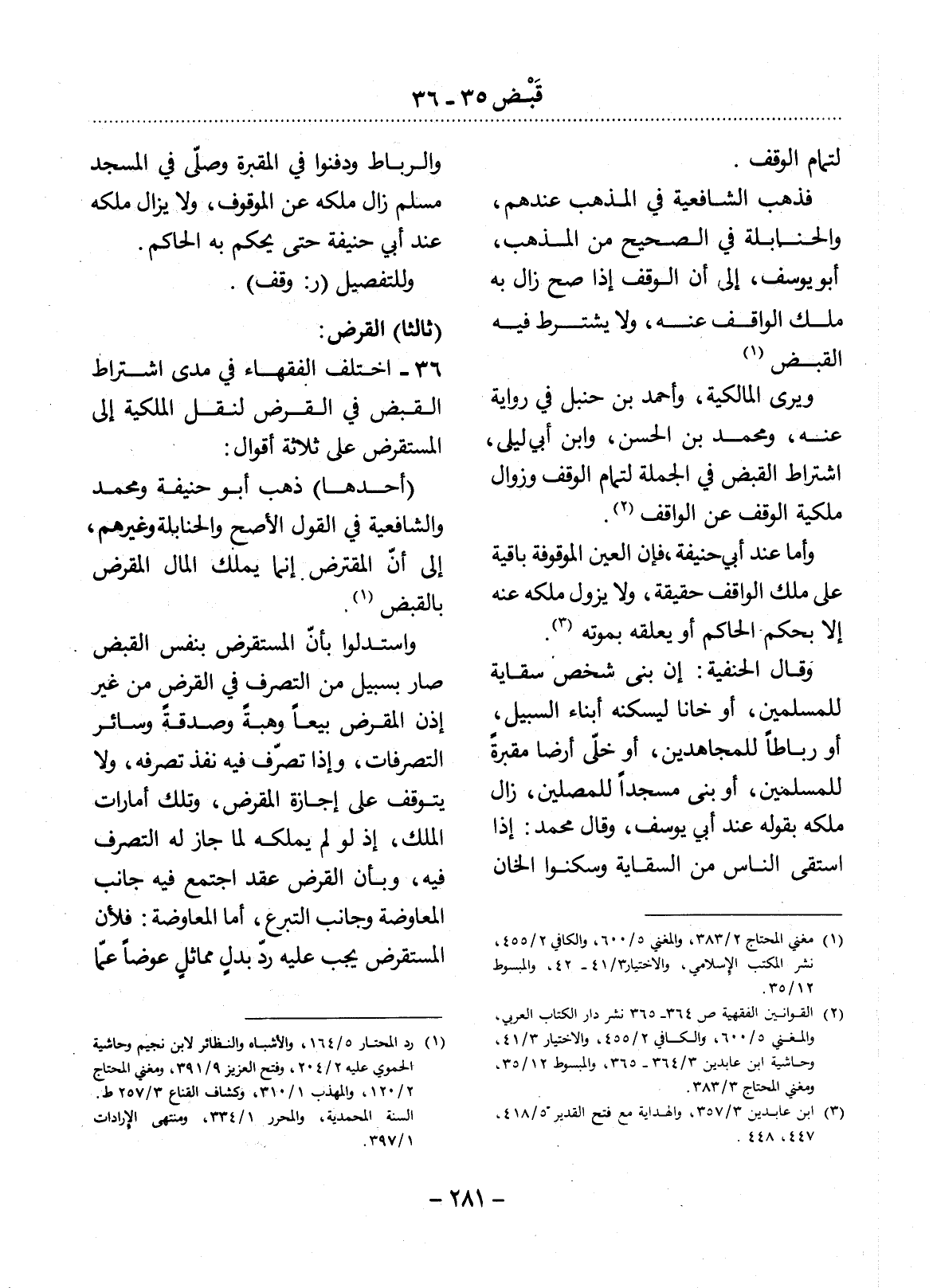 36 - اخْتَلَفَ الْفُقَهَاءُ فِي مَدَى اشْتِرَاطِ الْقَبْضِ فِي الْقَرْضِ لِنَقْل الْمِلْكِيَّةِ إلَى الْمُسْتَقْرِضِ عَلَى ثَلاَثَةِ أَقْوَالٍ:
