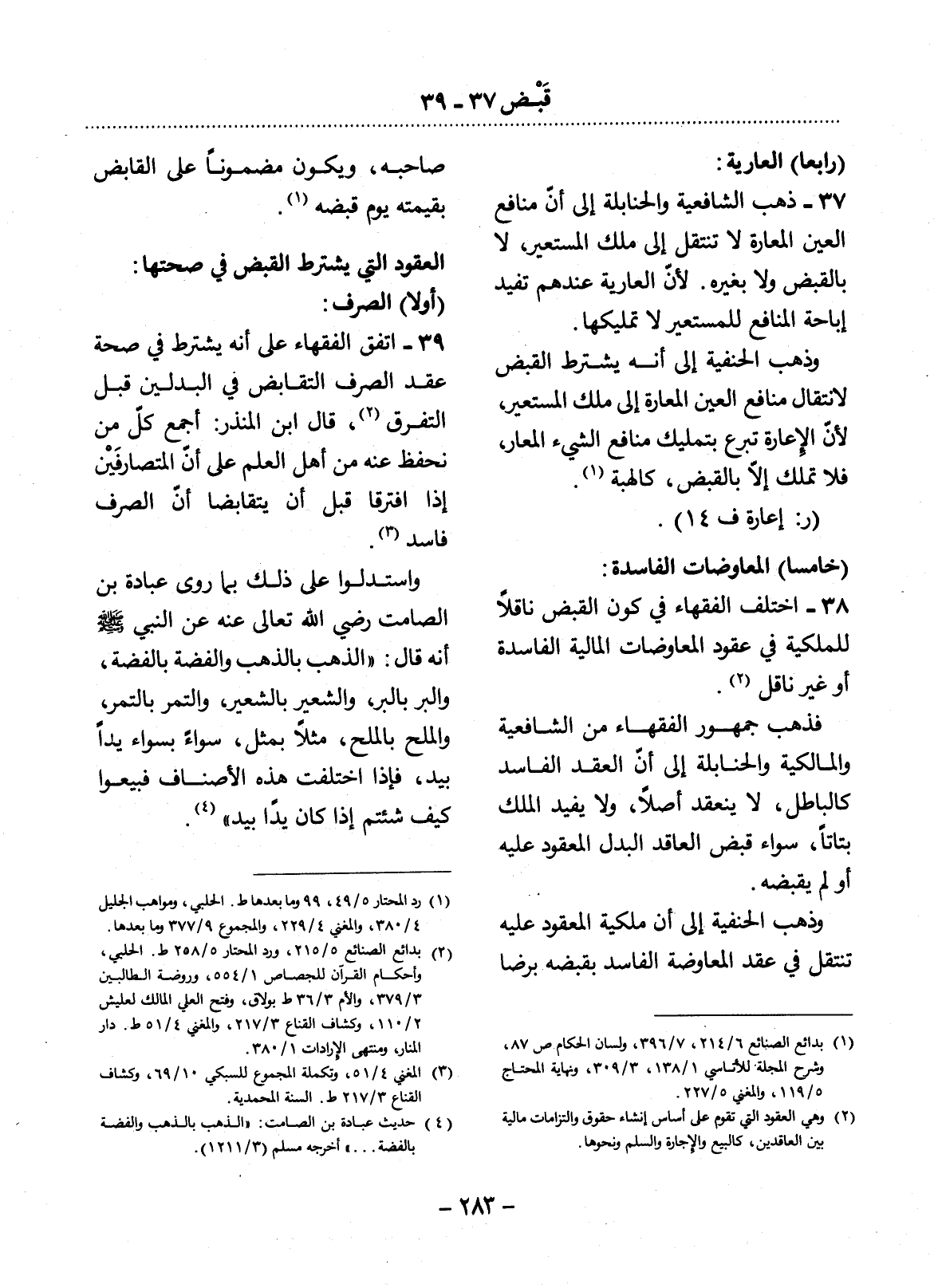 38 - اخْتَلَفَ الْفُقَهَاءُ فِي كَوْنِ الْقَبْضِ نَاقِلاً لِلْمِلْكِيَّةِ فِي عُقُودِ الْمُعَاوَضَاتِ الْمَالِيَّةِ الْفَاسِدَةِ أَوْ غَيْرَ نَاقِلٍ (2) .