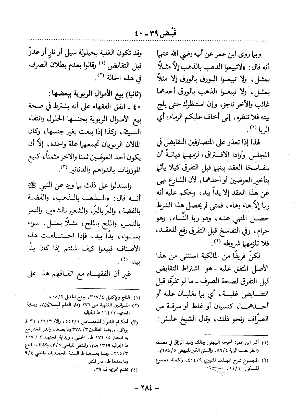 40 - اتَّفَقَ الْفُقَهَاءُ عَلَى أَنَّهُ يُشْتَرَطُ فِي صِحَّةِ بَيْعِ الأَْمْوَال الرِّبَوِيَّةِ بِجِنْسِهَا الْحُلُول وَانْتِفَاءُ النَّسِيئَةِ، وَكَذَا إذَا بِيعَتْ بِغَيْرِ جِنْسِهَا، وَكَانَ الْمَالاَنِ الرِّبَوِيَّانِ تَجْمَعُهُمَا عِلَّةٌ وَاحِدَةٌ، إلاَّ أَنْ يَكُونَ أَحَدُ الْعِوَضَيْنِ ثَمَنًا وَالآْخَرُ مُثَمَّنًا، كَبَيْعِ الْمَوْزُونَاتِ بِالدَّرَاهِمِ وَالدَّنَانِيرِ (3) .