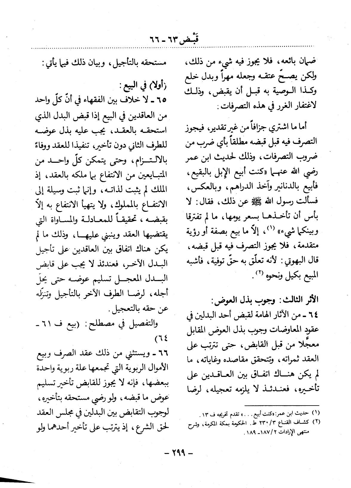 66 - وَيُسْتَثْنَى مِنْ ذَلِكَ عَقْدُ الصَّرْفِ وَبَيْعُ الأَْمْوَال الرِّبَوِيَّةِ الَّتِي تَجْمَعُهَا عِلَّةٌ رِبَوِيَّةٌ وَاحِدَةٌ بِبَعْضِهَا، فَإِنَّهُ لاَ يَجُوزُ لِلْقَابِضِ تَأْخِيرُ تَسْلِيمِ عِوَضِ مَا قَبَضَهُ، وَلَوْ رَضِيَ مُسْتَحِقُّهُ بِتَأْخِيرِهِ، لِوُجُوبِ التَّقَابُضِ بَيْنَ الْبَدَلَيْنِ فِي مَجْلِسِ الْعَقْدِ لِحَقِّ الشَّرْعِ، إذْ يَتَرَتَّبُ عَلَى تَأْخِيرِ أَحَدِهِمَا وَلَوْ