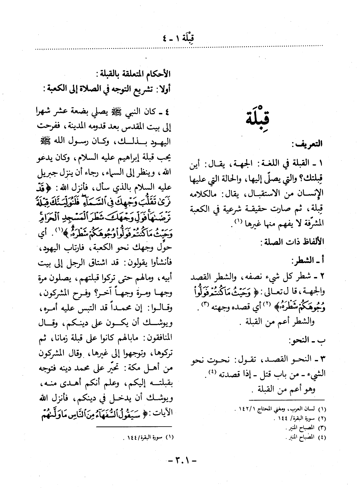 4 - كَانَ النَّبِيُّ صَلَّى اللَّهُ عَلَيْهِ وَسَلَّمَ يُصَلِّي بِضْعَةَ عَشَرَ شَهْرًا إلَى بَيْتِ الْمَقْدِسِ بَعْدَ قُدُومِهِ الْمَدِينَةَ، فَفَرِحَتِ الْيَهُودُ بِذَلِكَ، وَكَانَ رَسُول اللَّهِ صَلَّى اللَّهُ عَلَيْهِ وَسَلَّمَ يُحِبُّ قِبْلَةَ إبْرَاهِيمَ عَلَيْهِ السَّلَامُ، وَكَانَ يَدْعُو اللَّهَ، وَيَنْظُرُ إلَى السَّمَاءِ، رَجَاءَ أَنْ يَنْزِل جِبْرِيل عَلَيْهِ السَّلَامُ بِاَلَّذِي سَأَل، فَأَنْزَل اللَّهُ: {قَدْ نَرَى تَقَلُّبَ وَجْهِكَ فِي السَّمَاءِ فَلَنُوَلِّيَنَّكَ قِبْلَةً تَرْضَاهَا فَوَل وَجْهَك شَطْرَ الْمَسْجِدِ الْحَرَامِ وَحَيْثُ مَا كُنْتُمْ فَوَلُّوا وُجُوهَكُمْ شَطْرَهُ} . (1) أَيْ حَوِّل وَجْهَك نَحْوَ الْكَعْبَةِ، فَارْتَابَ الْيَهُودُ، فَأَنْشَئُوا يَقُولُونَ: قَدِ اشْتَاقَ الرَّجُل إلَى بَيْتِ أَبِيهِ، وَمَا لَهُمْ حَتَّى تَرَكُوا قِبْلَتَهُمْ، يُصَلُّونَ مَرَّةً وَجْهًا وَمَرَّةً وَجْهًا آخَرَ؟ وَفَرِحَ الْمُشْرِكُونَ، وَقَالُوا: إنَّ مُحَمَّدًا قَدِ الْتَبَسَ عَلَيْهِ أَمْرُهُ، وَيُوشِكُ أَنْ يَكُونَ عَلَى دِينِكُمْ، وَقَال الْمُنَافِقُونَ: مَا بَالُهُمْ كَانُوا عَلَى قِبْلَةٍ زَمَانًا، ثُمَّ تَرَكُوهَا، وَتَوَجَّهُوا إلَى غَيْرِهَا، وَقَال الْمُشْرِكُونَ مِنْ أَهْل مَكَّةَ: تَحَيَّرَ عَلَى مُحَمَّدٍ دِينُهُ فَتَوَجَّهَ بِقِبْلَتِهِ إلَيْكُمْ، وَعَلِمَ أَنَّكُمْ أَهْدَى مِنْهُ، وَيُوشِكُ أَنْ يَدْخُل فِي دِينِكُمْ، فَأَنْزَل اللَّهُ الآْيَاتِ: {سَيَقُول السُّفَهَاءُ مِنَ النَّاسِ مَا وَلاَّهُمْ