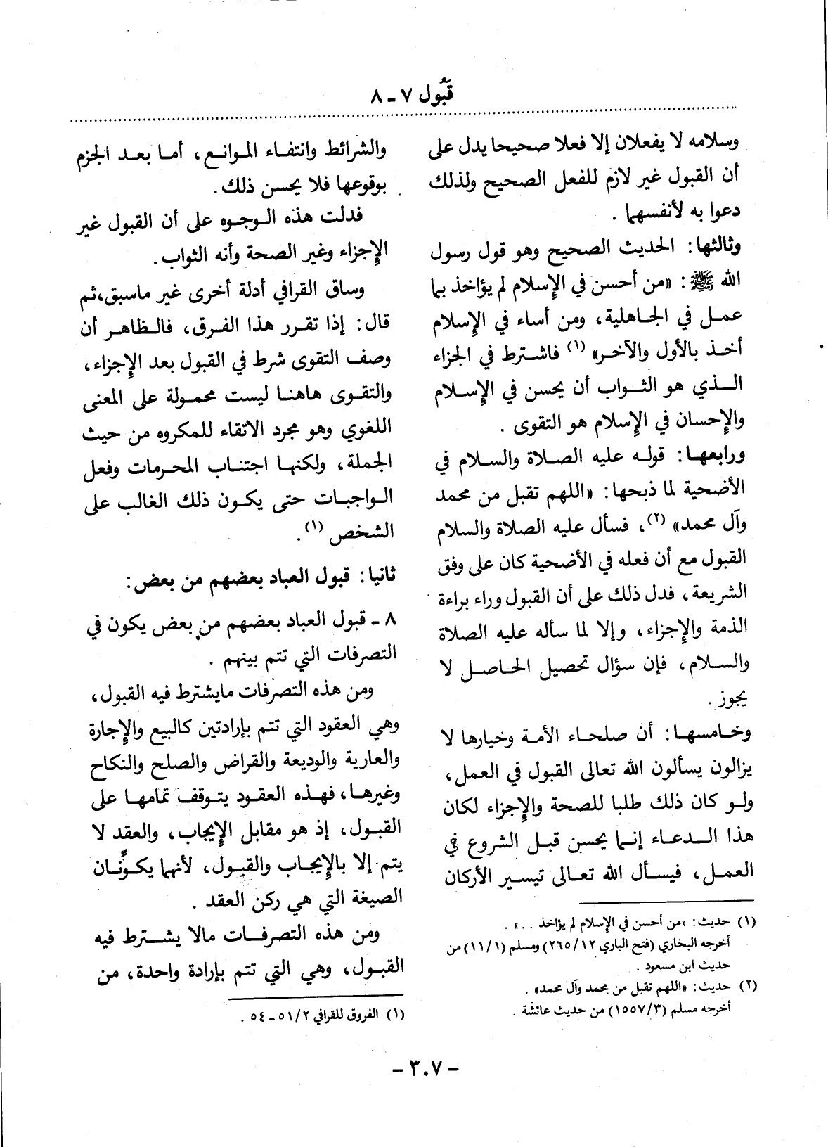 وَسَاقَ الْقَرَافِيُّ أَدِلَّةً أُخْرَى غَيْرَ مَا سَبَقَ، ثُمَّ قَال: إذَا تَقَرَّرَ هَذَا الْفَرْقُ، فَالظَّاهِرُ أَنَّ وَصْفَ التَّقْوَى شَرْطٌ فِي الْقَبُول بَعْدَ الإِْجْزَاءِ، وَالتَّقْوَى هَاهُنَا لَيْسَتْ مَحْمُولَةً عَلَى الْمَعْنَى اللُّغَوِيِّ وَهُوَ مُجَرَّدُ الاِتِّقَاءِ لِلْمَكْرُوهِ مِنْ حَيْثُ الْجُمْلَةُ، وَلَكِنَّهَا اجْتِنَابُ الْمُحَرَّمَاتِ وَفِعْل الْوَاجِبَاتِ حَتَّى يَكُونَ ذَلِكَ الْغَالِبَ عَلَى الشَّخْصِ (1)