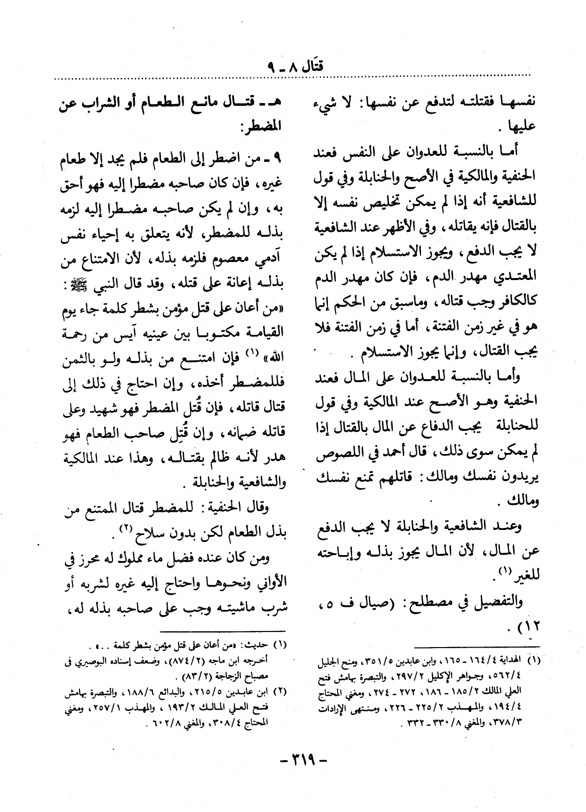 9 - مَنِ اُضْطُرَّ إلَى الطَّعَامِ فَلَمْ يَجِدْ إلاَّ طَعَامَ غَيْرِهِ، فَإِنْ كَانَ صَاحِبُهُ مُضْطَرًّا إلَيْهِ فَهُوَ أَحَقُّ بِهِ، وَإِنْ لَمْ يَكُنْ صَاحِبُهُ مُضْطَرًّا إلَيْهِ لَزِمَهُ بَذْلُهُ لِلْمُضْطَرِّ، لأَِنَّهُ يَتَعَلَّقُ بِهِ إحْيَاءُ نَفْسِ آدَمِيٍّ مَعْصُومٍ فَلَزِمَهُ بَذْلُهُ، لأَِنَّ الاِمْتِنَاعَ مِنْ بَذْلِهِ إعَانَةٌ عَلَى قَتْلِهِ، وَقَدْ قَال النَّبِيُّ صَلَّى اللَّهُ عَلَيْهِ وَسَلَّمَ: مَنْ أَعَانَ عَلَى قَتْل مُؤْمِنٍ بِشَطْرِ كَلِمَةٍ جَاءَ يَوْمَ الْقِيَامَةِ مَكْتُوبًا بَيْنَ عَيْنَيْهِ آيِسٌ مِنْ رَحْمَةِ اللَّهِ (1) فَإِنِ امْتَنَعَ مِنْ بَذْلِهِ وَلَوْ بِالثَّمَنِ فَلِلْمُضْطَرِّ أَخْذُهُ، وَإِنِ احْتَاجَ فِي ذَلِكَ إلَى قِتَالٍ قَاتَلَهُ، فَإِنْ قُتِل الْمُضْطَرُّ فَهُوَ شَهِيدٌ وَعَلَى قَاتِلِهِ ضَمَانُهُ، وَإِنْ قُتِل صَاحِبُ الطَّعَامِ فَهُوَ هَدَرٌ لأَِنَّهُ ظَالِمٌ بِقِتَالِهِ، وَهَذَا عِنْدَ الْمَالِكِيَّةِ وَالشَّافِعِيَّةِ وَالْحَنَابِلَةِ.