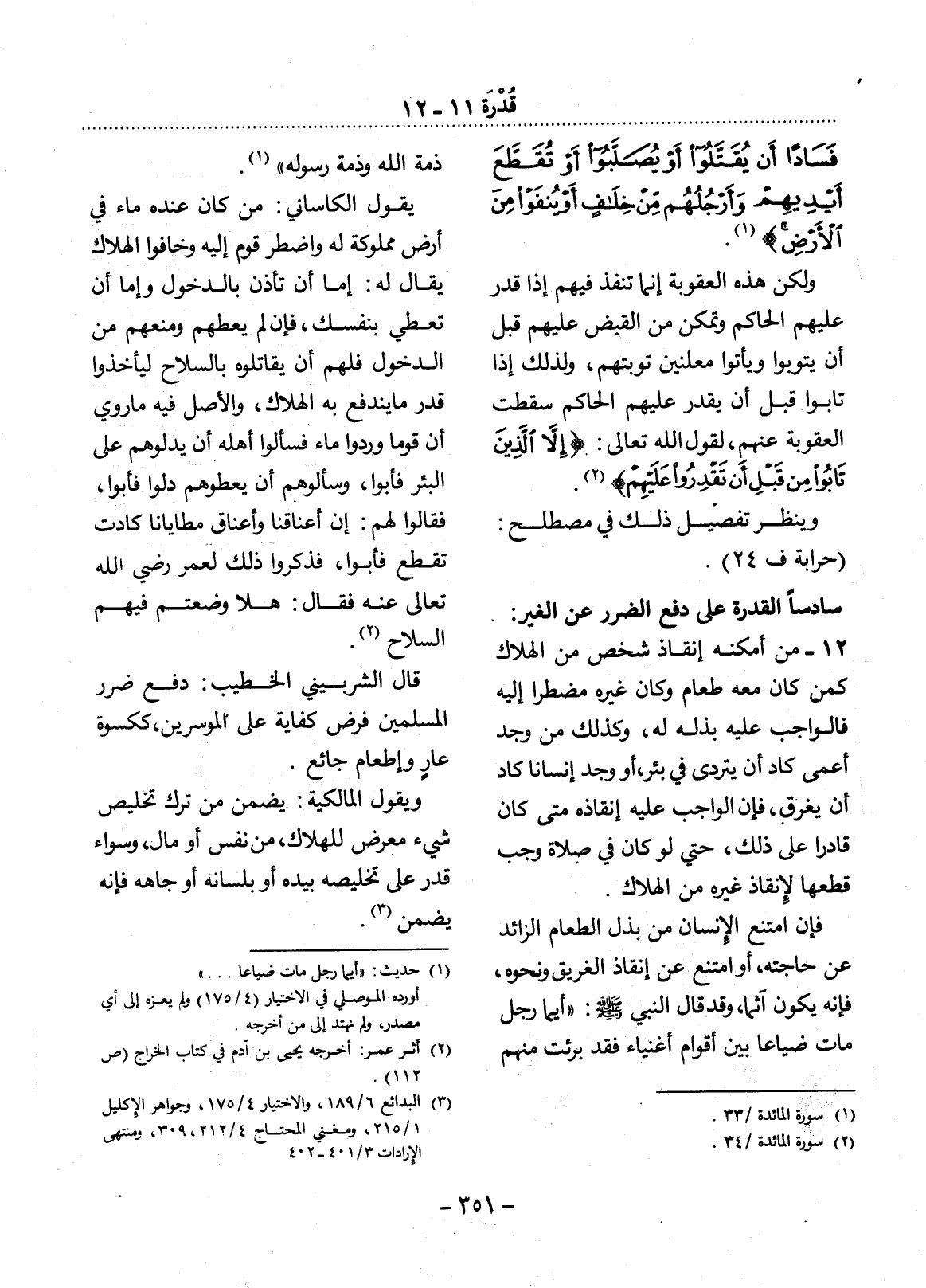 12 - مَنْ أَمْكَنَهُ إنْقَاذُ شَخْصٍ مِنَ الْهَلاَكِ كَمَنْ كَانَ مَعَهُ طَعَامٌ وَكَانَ غَيْرُهُ مُضْطَرًّا إلَيْهِ فَالْوَاجِبُ عَلَيْهِ بَذْلُهُ لَهُ، وَكَذَلِكَ مَنْ وَجَدَ أَعْمَى كَادَ أَنْ يَتَرَدَّى فِي بِئْرٍ، أَوْ وَجَدَ إنْسَانًا كَادَ أَنْ يَغْرَقَ، فَإِنَّ الْوَاجِبَ عَلَيْهِ إنْقَاذُهُ مَتَى كَانَ قَادِرًا عَلَى ذَلِكَ، حَتَّى لَوْ كَانَ فِي صَلاَةٍ وَجَبَ قَطْعُهَا لإِِنْقَاذِ غَيْرِهِ مِنَ الْهَلاَكِ.