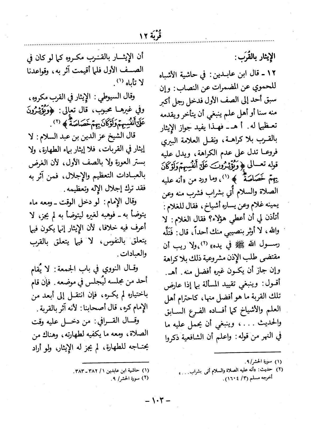فَهَذَا يُفِيدُ جَوَازَ الإِْيثَارِ بِالْقُرَبِ بِلاَ كَرَاهَةٍ، وَنَقَل الْعَلاَّمَةُ الْبِيرِيُّ فُرُوعًا تَدُل عَلَى عَدَمِ الْكَرَاهَةِ، وَيَدُل عَلَيْهِ قَوْله تَعَالَى {وَيُؤْثِرُونَ عَلَى أَنْفُسِهِمْ وَلَوْ كَانَ بِهِمْ خَصَاصَةٌ} (1) ، وَمَا وَرَدَ مِنْ أَنَّهُ عَلَيْهِ الصَّلَاةُ وَالسَّلَامُ أُتِيَ بِشَرَابٍ فَشَرِبَ مِنْهُ وَعَنْ يَمِينِهِ غُلاَمٌ وَعَنْ يَسَارِهِ أَشْيَاخٌ، فَقَال لِلْغُلاَمِ: أَتَأْذَنُ لِي أَنْ أُعْطِيَ هَؤُلاَءِ؟ فَقَال الْغُلاَمُ: لاَ وَاللَّهِ، لاَ أُوثِرَ بِنَصِيبِي مِنْكَ أَحَدًا، قَال: فَتَلَّهُ رَسُول اللَّهِ صَلَّى اللَّهُ عَلَيْهِ وَسَلَّمَ فِي يَدِهِ (2) ، وَلاَ رَيْبَ أَنَّ مُقْتَضَى طَلَبِ الإِْذْنِ مَشْرُوعِيَّةُ ذَلِكَ بِلاَ كَرَاهَةٍ وَإِنْ جَازَ أَنْ يَكُونَ غَيْرُهُ أَفْضَل مِنْهُ. أهـ.