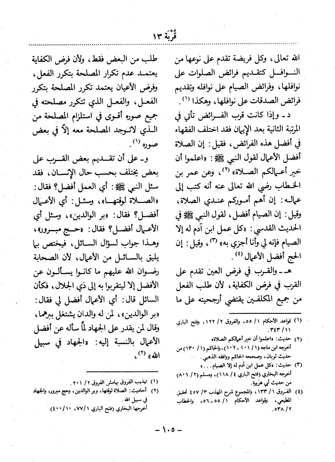 د - وَإِذَا كَانَتْ قُرَبُ الْفَرَائِضِ تَأْتِي فِي الْمَرْتَبَةِ الثَّانِيَةِ بَعْدَ الإِْيمَانِ فَقَدِ اخْتَلَفَ الْفُقَهَاءُ فِي أَفْضَل هَذِهِ الْفَرَائِضِ، فَقِيل: إِنَّ الصَّلاَةَ أَفْضَل الأَْعْمَال لِقَوْل النَّبِيِّ صَلَّى اللَّهُ عَلَيْهِ وَسَلَّمَ: اعْلَمُوا أَنَّ خَيْرَ أَعْمَالِكُمُ الصَّلاَةُ (2) ، وَعَنْ عُمَرَ بْنِ الْخَطَّابِ رَضِيَ اللَّهُ تَعَالَى عَنْهُ أَنَّهُ كَتَبَ إِلَى عُمَّالِهِ: إِنَّ أَهَمَّ أُمُورِكُمْ عِنْدِي الصَّلاَةُ، وَقِيل: إِنَّ الصِّيَامَ أَفْضَل، لِقَوْل النَّبِيِّ صَلَّى اللَّهُ عَلَيْهِ وَسَلَّمَ فِي الْحَدِيثِ الْقُدْسِيِّ: كُل عَمَل ابْنِ آدَمَ لَهُ إِلاَّ الصِّيَامَ فَإِنَّهُ لِي وَأَنَا أَجْزِي بِهِ (3) ، وَقِيل: إِنَّ الْحَجَّ أَفْضَل الأَْعْمَال (4) .