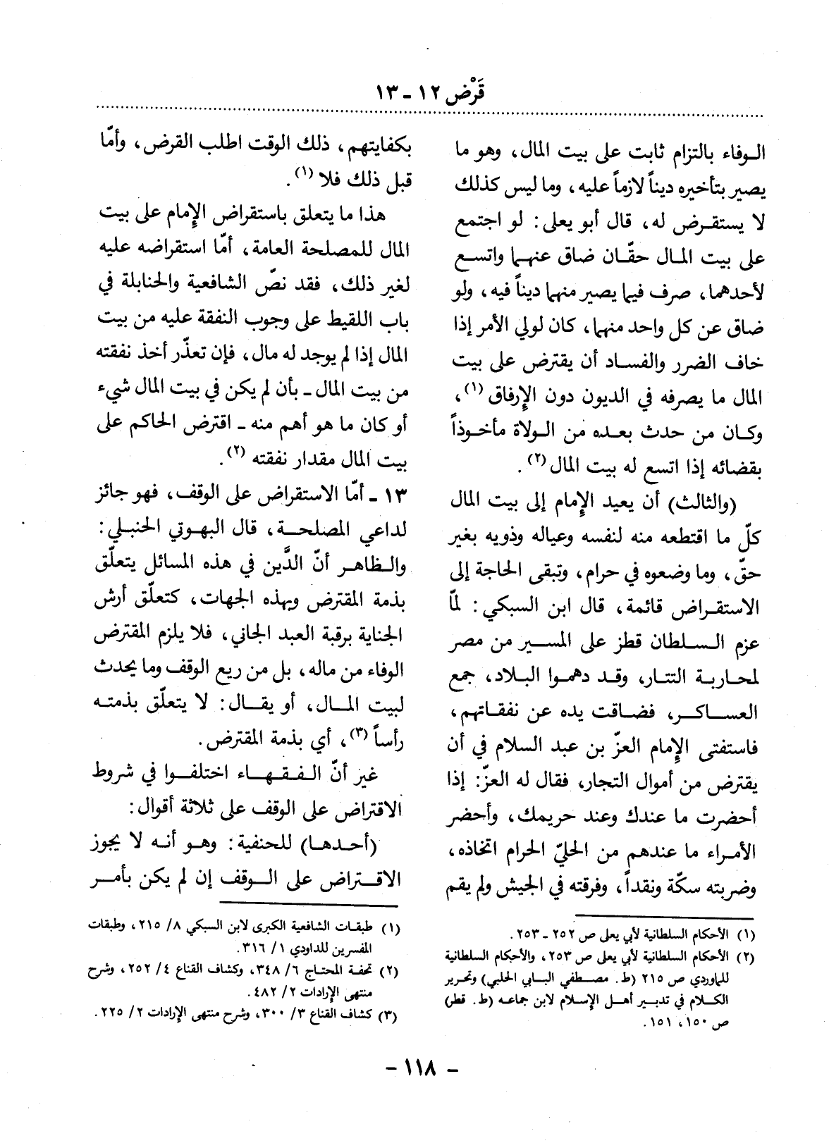 الْوَفَاءِ بِالْتِزَامٍ ثَابِتٍ عَلَى بَيْتِ الْمَال، وَهُوَ مَا يَصِيرُ بِتَأْخِيرِهِ دَيْنًا لاَزِمًا عَلَيْهِ، وَمَا لَيْسَ كَذَلِكَ لاَ يُسْتَقْرَضُ لَهُ، قَال أَبُو يَعْلَى: لَوِ اجْتَمَعَ عَلَى بَيْتِ الْمَال حَقَّانِ ضَاقَ عَنْهُمَا وَاتَّسَعَ لأَِحَدِهِمَا، صُرِفَ فِيمَا يَصِيرُ مِنْهُمَا دَيْنًا فِيهِ، وَلَوْ ضَاقَ عَنْ كُل وَاحِدٍ مِنْهُمَا، كَانَ لِوَلِيِّ الأَْمْرِ إِذَا خَافَ الضَّرَرَ وَالْفَسَادَ أَنْ يَقْتَرِضَ عَلَى بَيْتِ الْمَال مَا يَصْرِفُهُ فِي الدُّيُونِ دُونَ الإِْرْفَاقِ (1) ، وَكَانَ مَنْ حَدَثَ بَعْدَهُ مِنَ الْوُلاَةِ مَأْخُوذًا بِقَضَائِهِ إِذَا اتَّسَعَ لَهُ بَيْتُ الْمَال (2) .