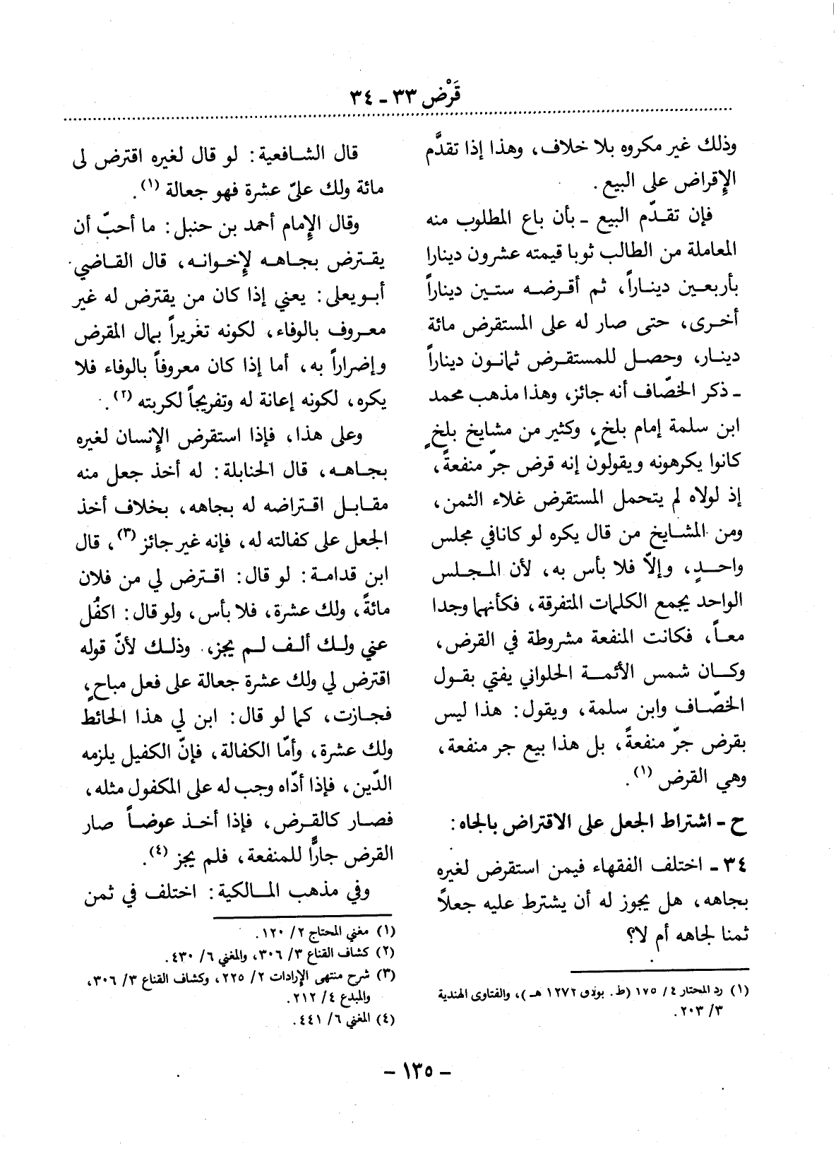 34 - اخْتَلَفَ الْفُقَهَاءُ فِيمَنِ اسْتَقْرَضَ لِغَيْرِهِ بِجَاهِهِ، هَل يَجُوزُ لَهُ أَنْ يَشْتَرِطَ عَلَيْهِ جُعْلاً ثَمَنًا لِجَاهِهِ أَمْ لاَ؟